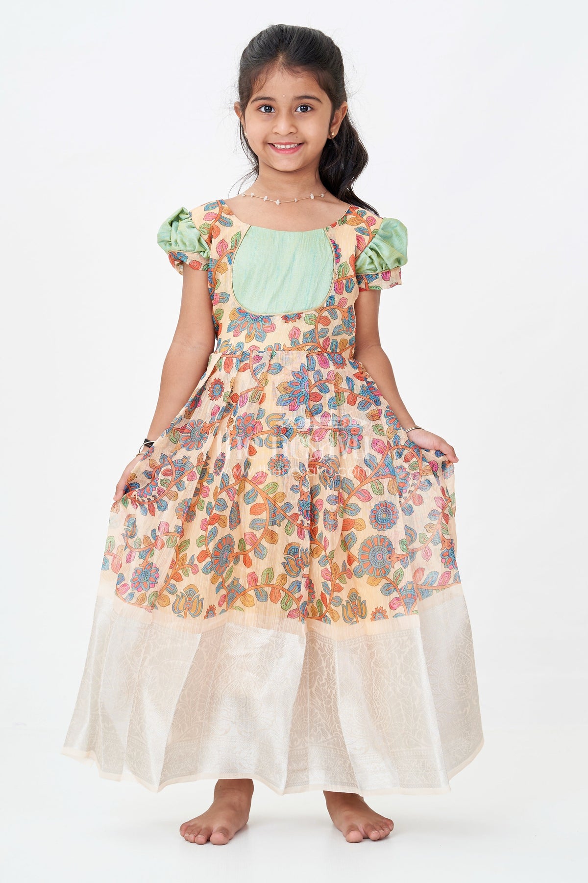 Yellow gown dress for girls by Nesavu is an elegant statement piece crafted from Chanderi cotton with a richly textured raw silk yoke. Designed to captivate, this traditional-inspired gown features multicolored floral embroidery cascading across the upper body, enhancing its festive charm. The lightweight lower skirt showcases intricate silver-toned zari weaving, adding a regal touch while maintaining comfort. Puff sleeves and a fitted bodice balance the flared bottom, making it both graceful and child-friendly. Ideal for family gatherings or special cultural days, this dress beautifully blends heritage fabrics and kid-friendly tailoring to create an heirloom-worthy piece.