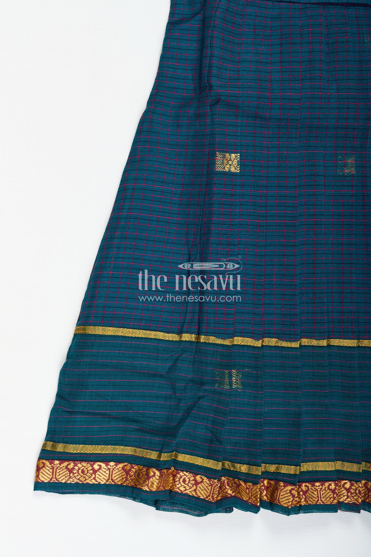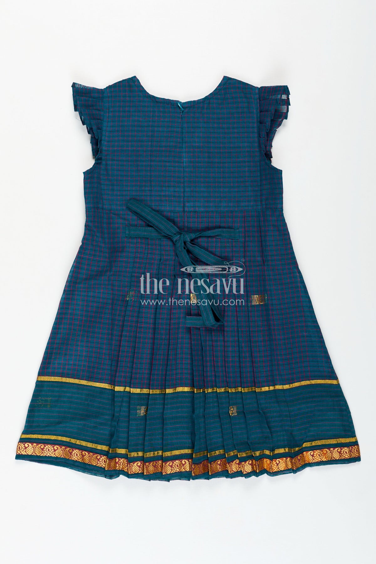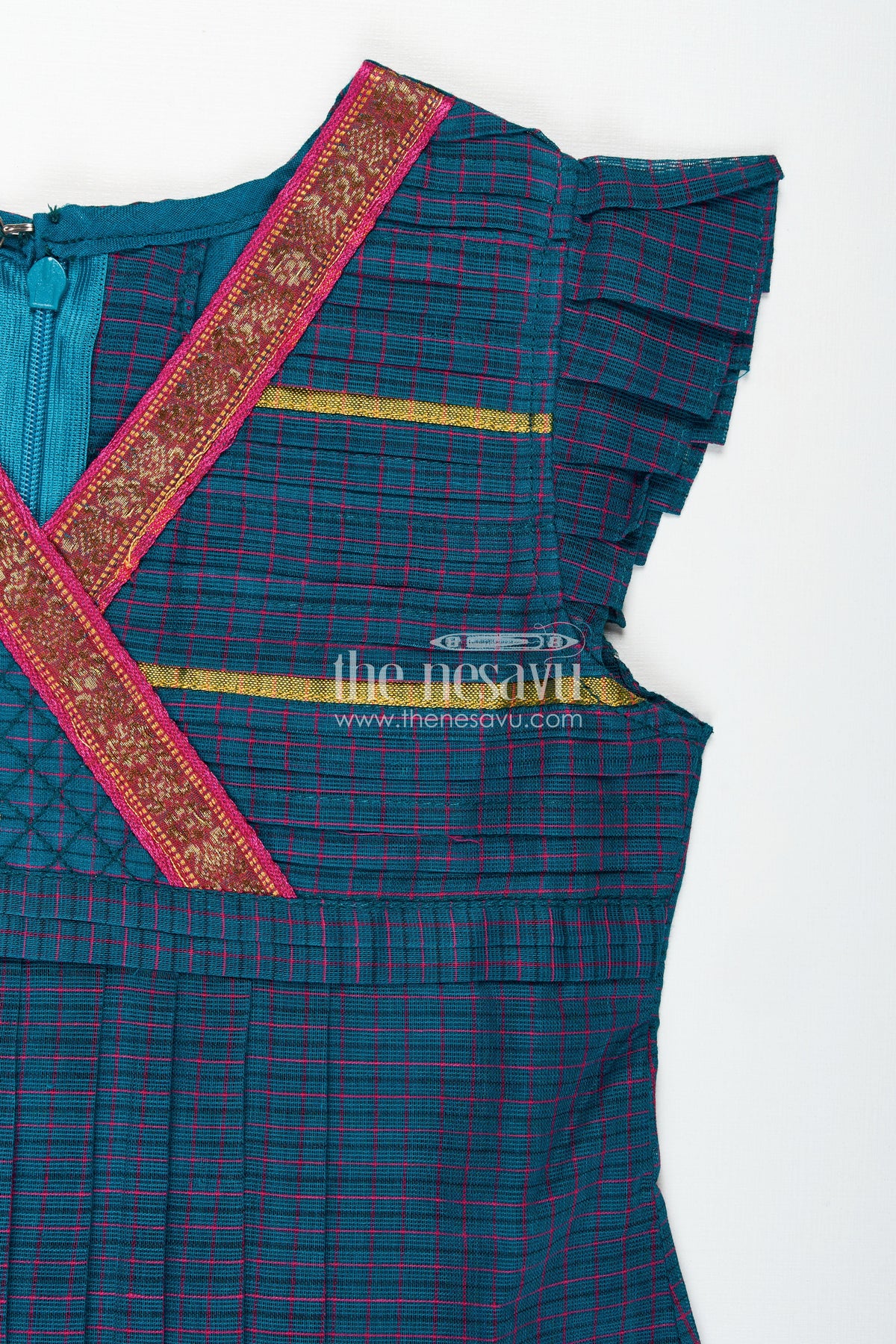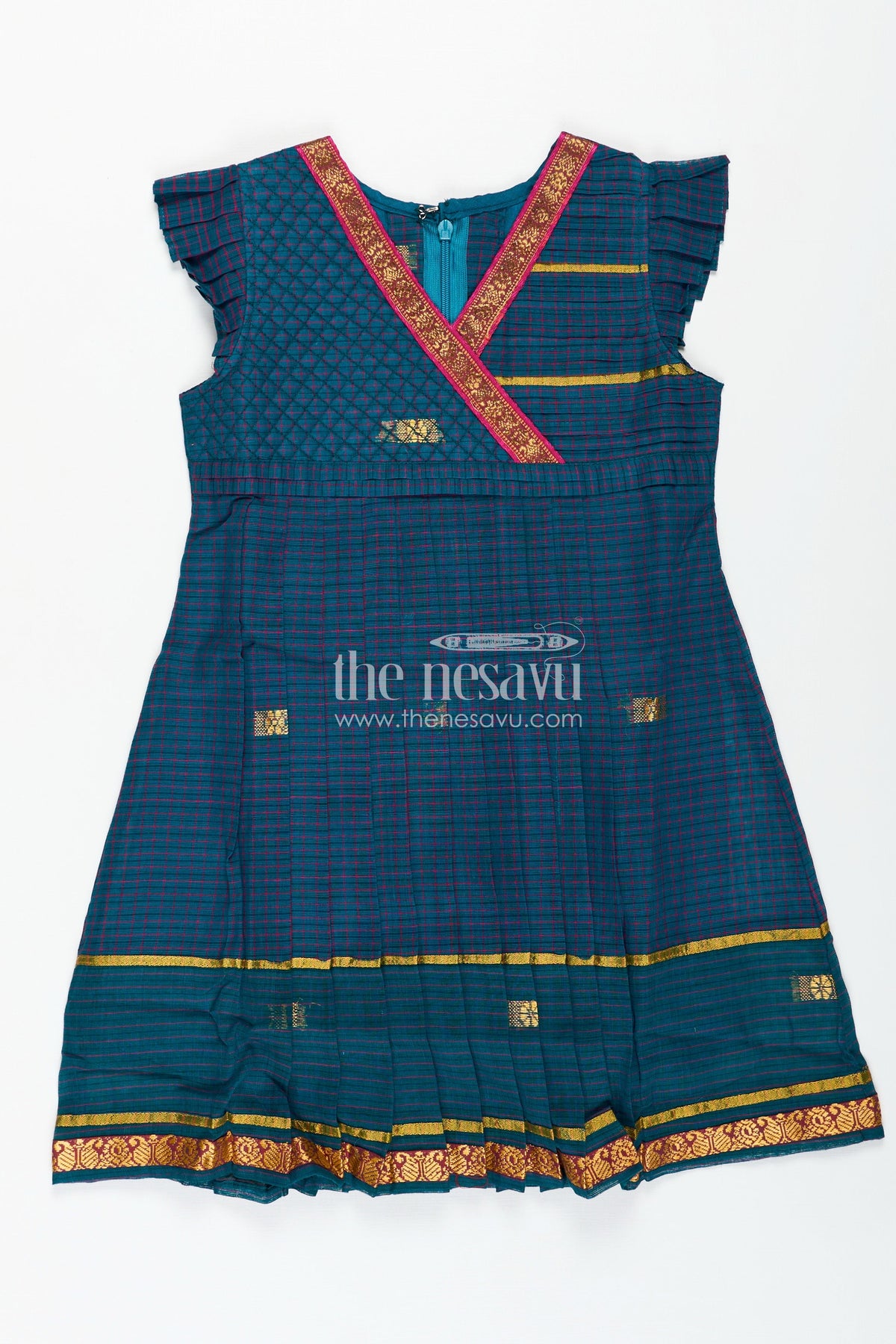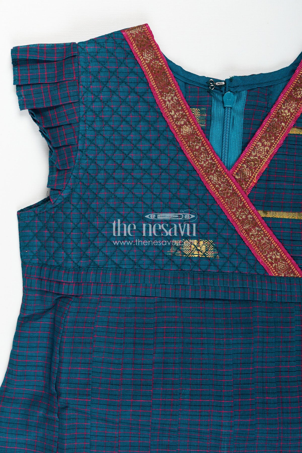 Girls Handwoven Frock is crafted from rich teal Mangalagiri cotton, known for its durability and breathability. This traditional-style frock features handwoven patterns enhanced with bright gold zari trims along the hem, neckline, and pleated border. The V-shaped neckline is detailed with contrasting piping and the sleeveless design ensures cool comfort, especially during warm weather. Perfect for cultural celebrations and family occasions, this frock is a heritage piece with modern ease for girls who appreciate classic Indian textiles.