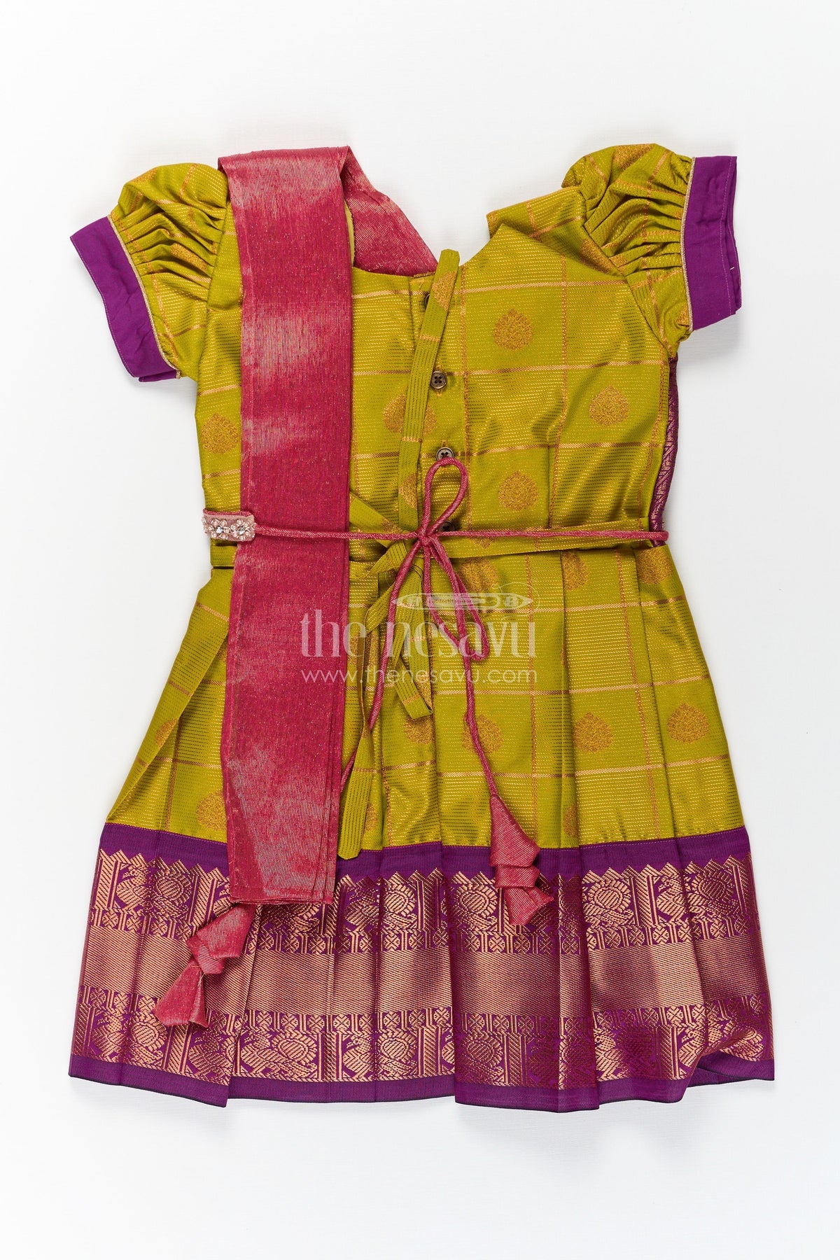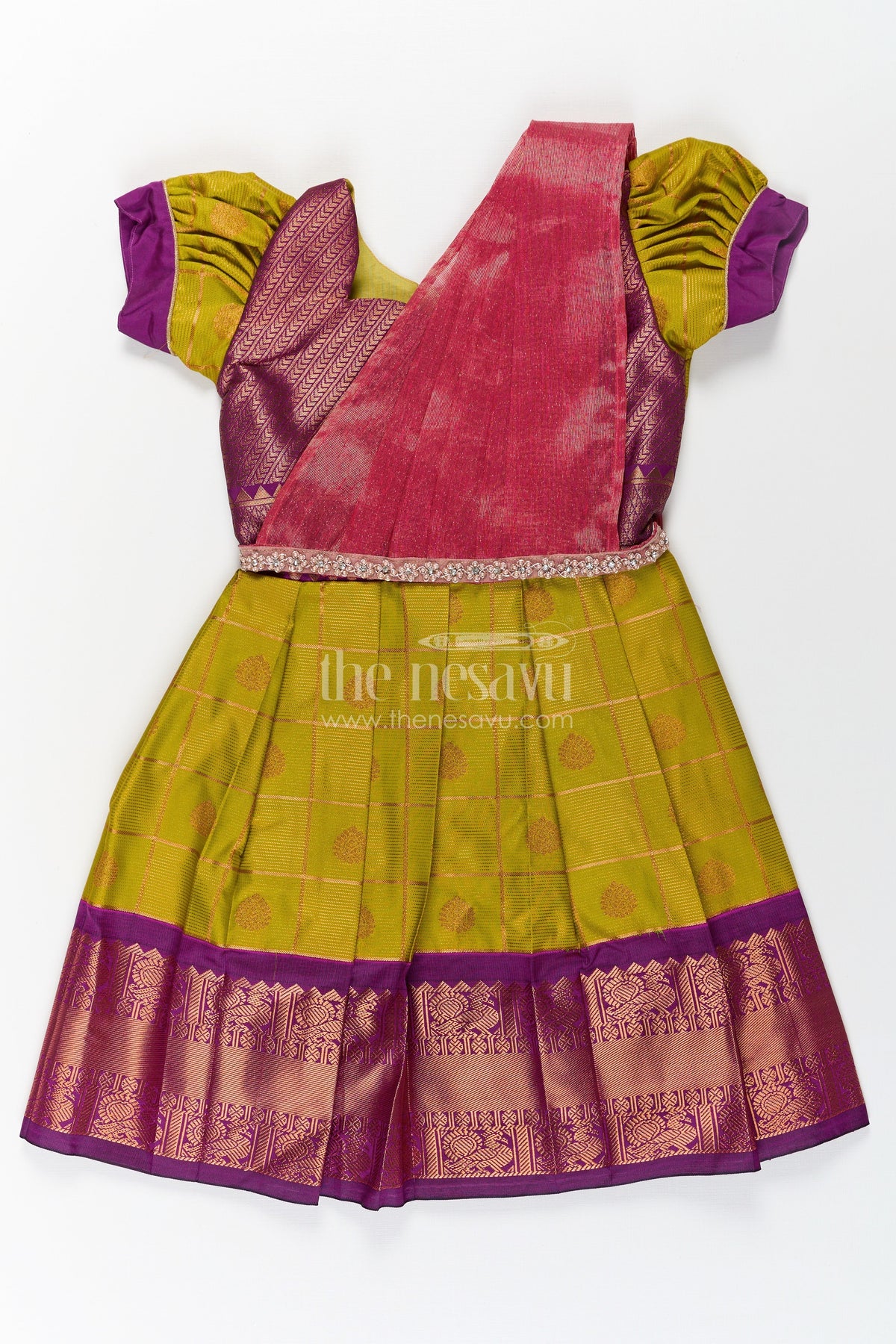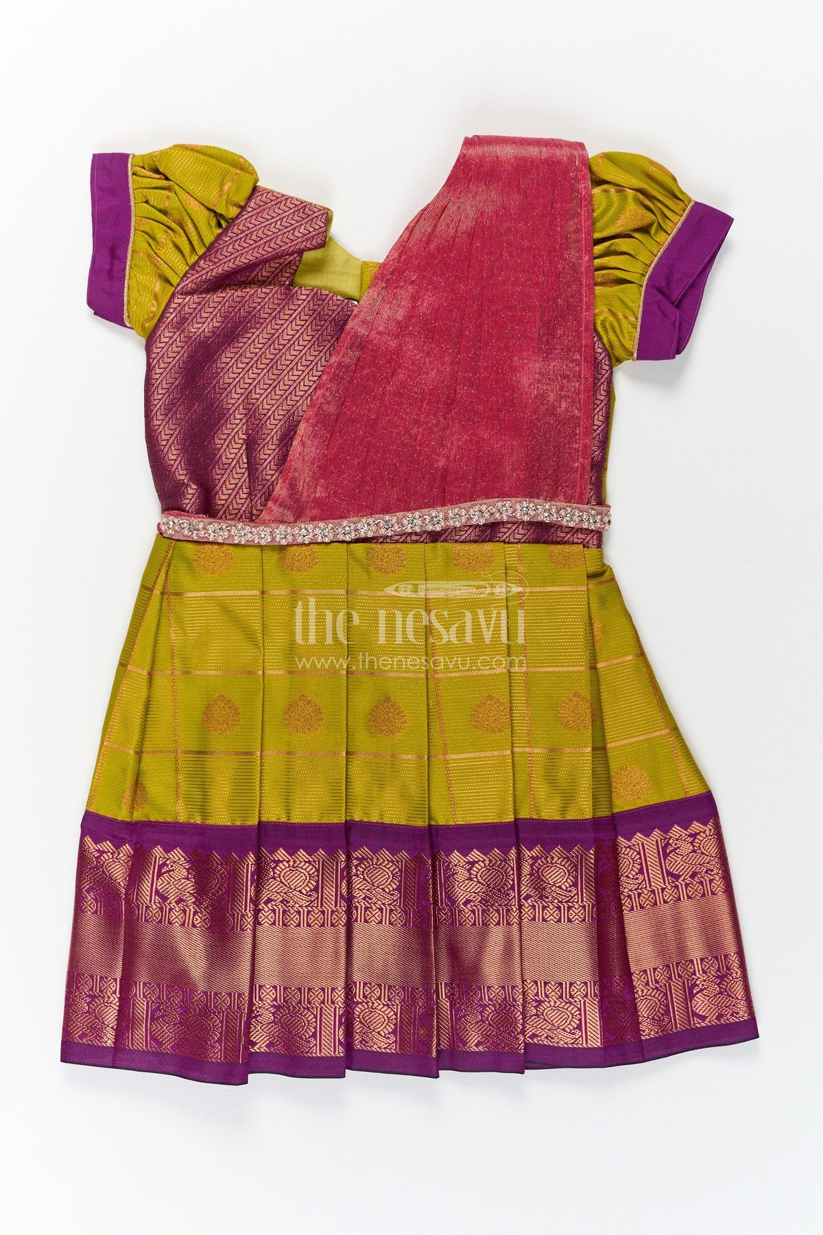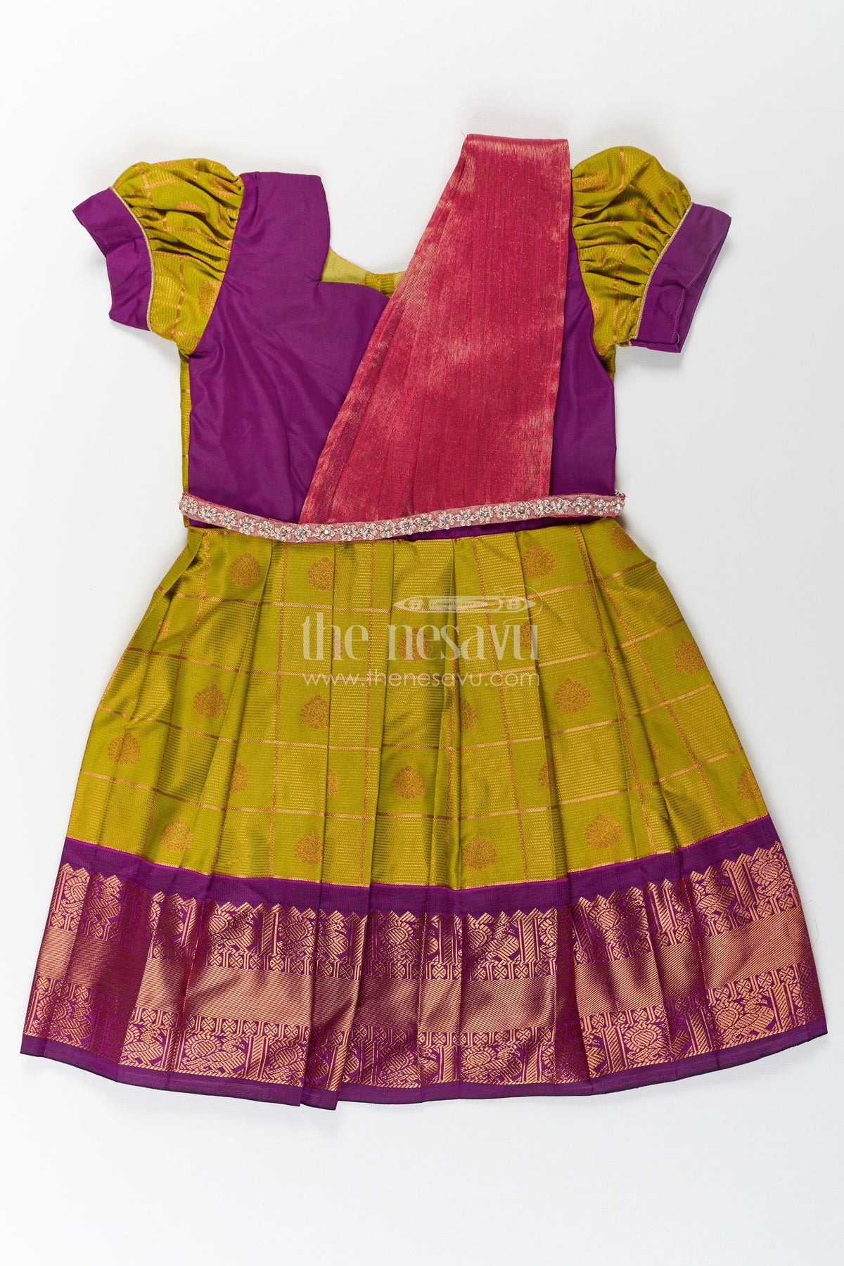 Stone golden lace design shines brilliantly in this girls Kanchi silk frock, bringing together festive flair and traditional elegance in a fun, wearable style. Crafted from semi Kanchivaram silk, this frock is a celebration of color with its vibrant lime green pleated skirt beautifully offset by rich purple zari borders. The bodice features a maroon-toned brocade weave with intricate leaf motifs, perfectly complemented by puff sleeves in a striking green-and-purple combination. A matching maroon dupatta gracefully drapes across the shoulder and is enhanced with a shimmering stone-embedded golden lace belt for that extra sparkle. This dress is designed to ensure both style and comfort for young girls, thanks to its soft texture, breathable fabric, and lightweight fit. Perfect for family celebrations, cultural events, or festive occasions, this frock offers a royal look with the ease of everyday wear.