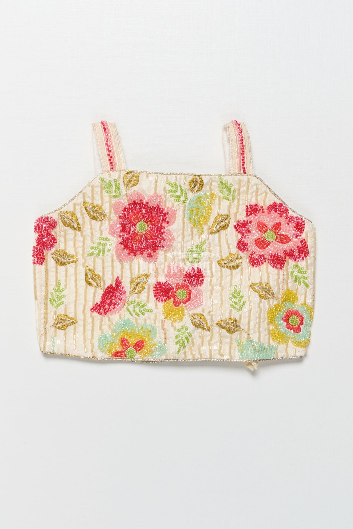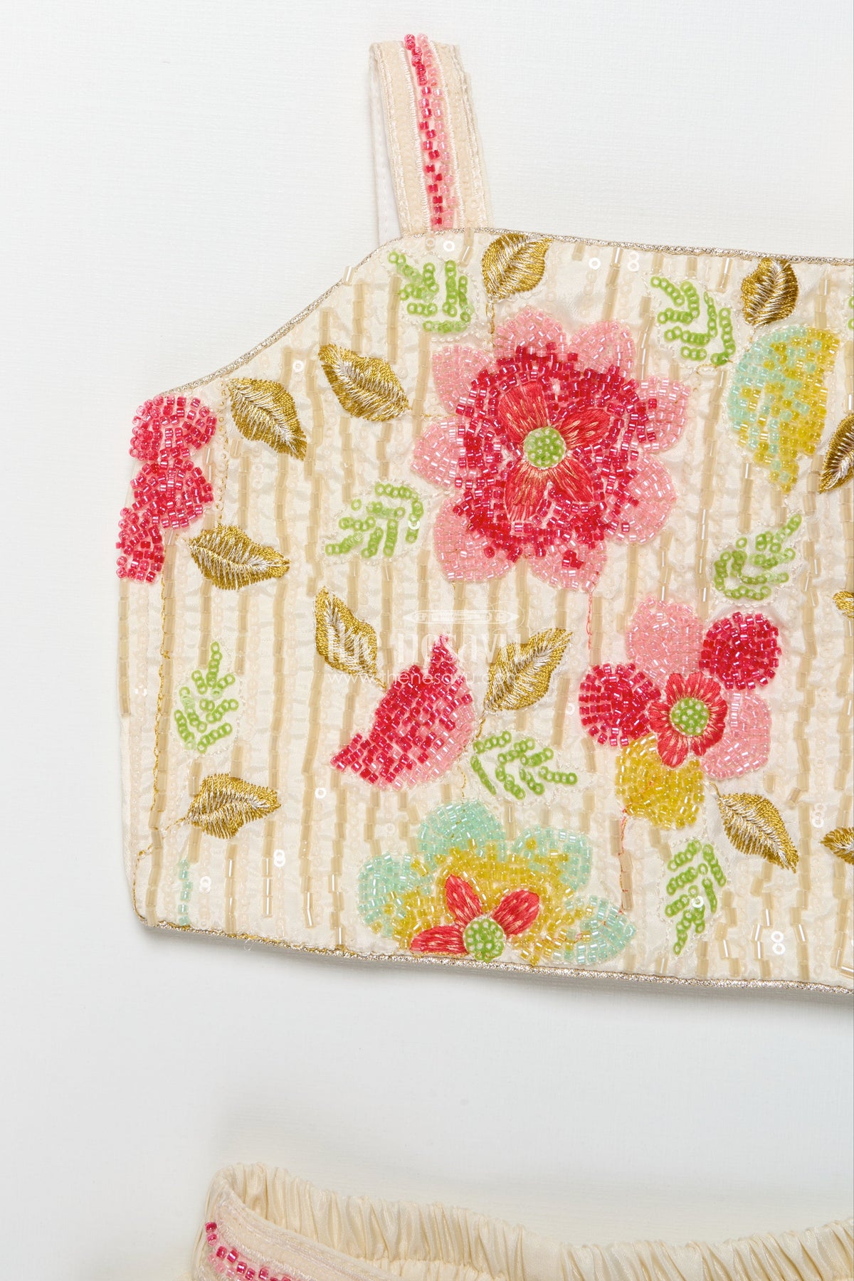 • Sleeveless blouse features detailed designer embroidery with vibrant floral patterns