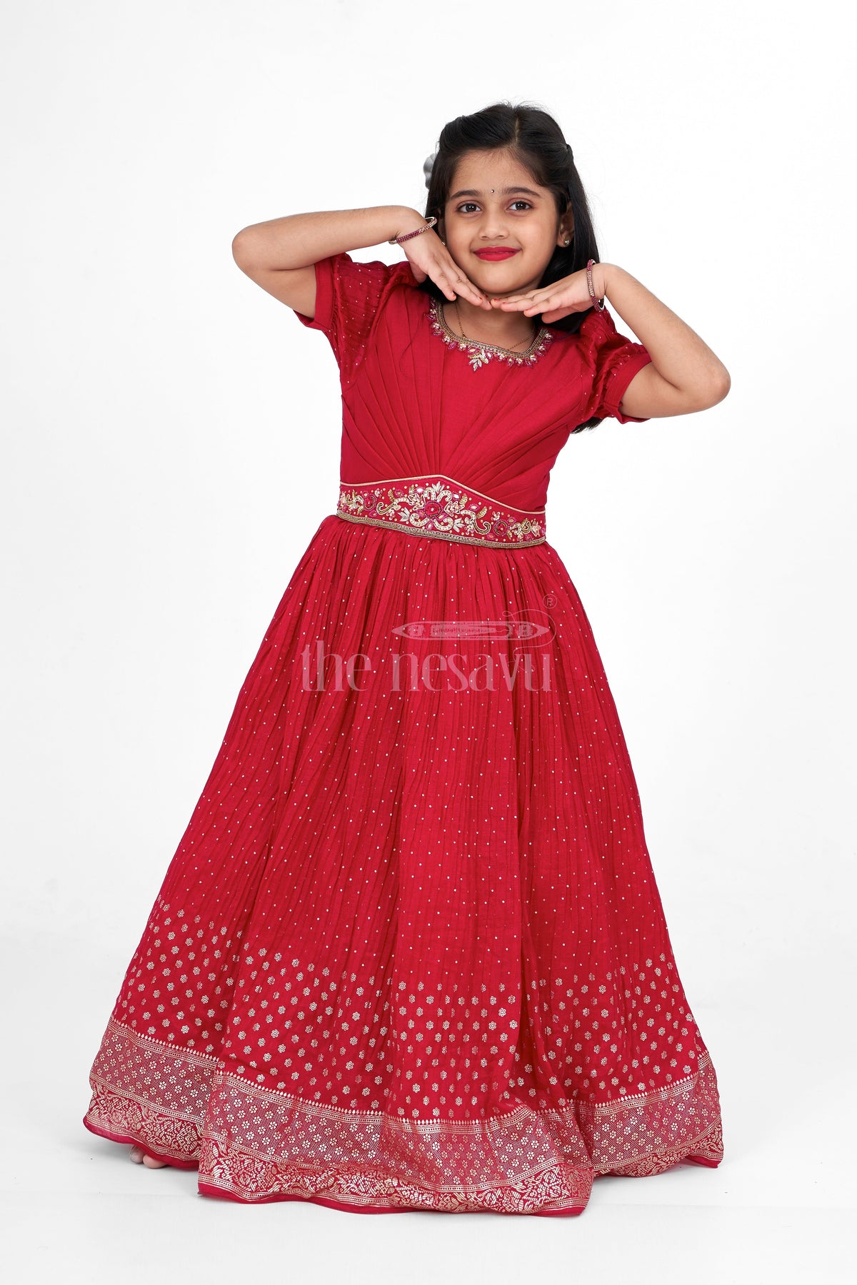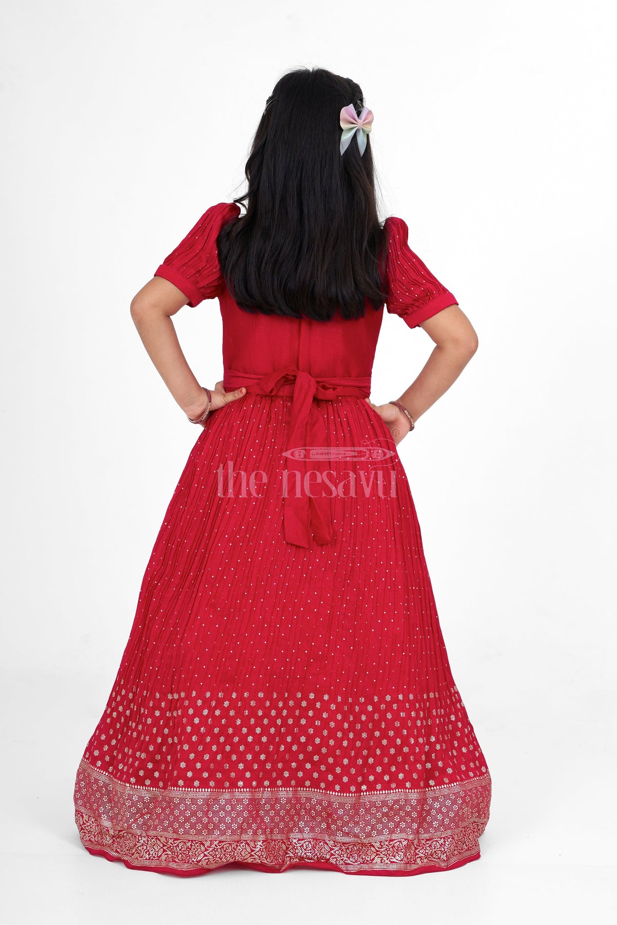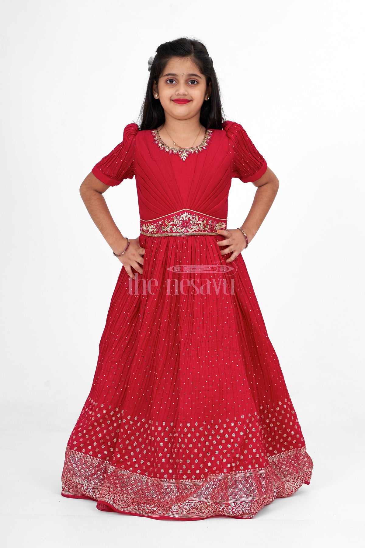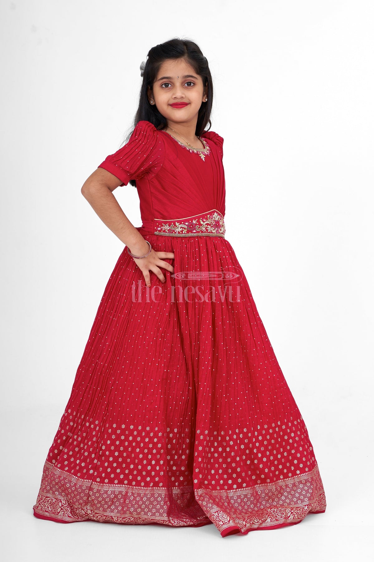 This party gown for ladies is a perfect blend of elegance and style, crafted to make any young girl feel like a princess. Made from high-quality blended fabric, this rich red gown features delicate gold embellishments across the skirt and bodice, adding a touch of glamour. The gown has a unique pleated design and puff sleeves, creating a timeless look suitable for birthday celebrations or family gatherings. Designed for comfort and style, this gown ensures she moves freely while looking stunning at any event.