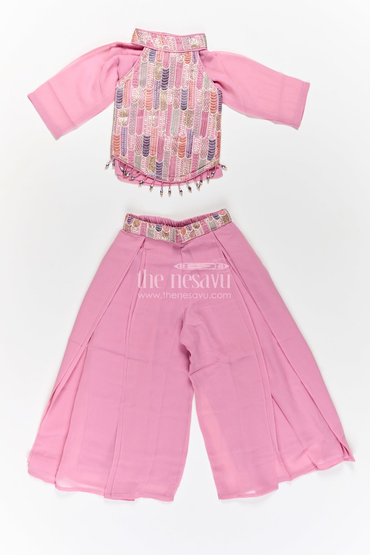The Nesavu Girls Sharara / Plazo Set Girls Georgette Sharara Suit in Mauve with Embroidered Yoke and Palazzo Pants Set Nesavu 18 (2Y) / Pink GPS621A-18 Girls Georgette Sharara Suit Mauve Thread Embroidery Yoke Palazzo Dupatta Set | The Nesavu