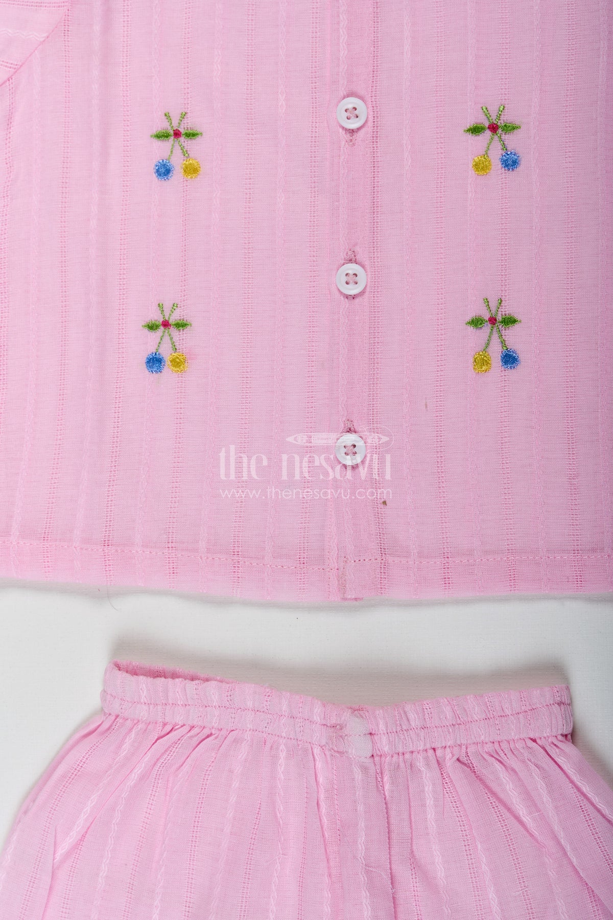 Casual dress for birthday has never looked this sweet and comfortable. This lavender cotton baby set features delicate thread embroidery and fine vertical weave detailing that adds depth to its pastel charm. The button-up top is easy to wear and breathable, paired with soft shorts for a coordinated look that doesn’t compromise on comfort. Whether it’s a birthday celebration or a casual day out, this outfit strikes the perfect balance between function and festive flair, giving your baby girl a stylish head start in every setting.