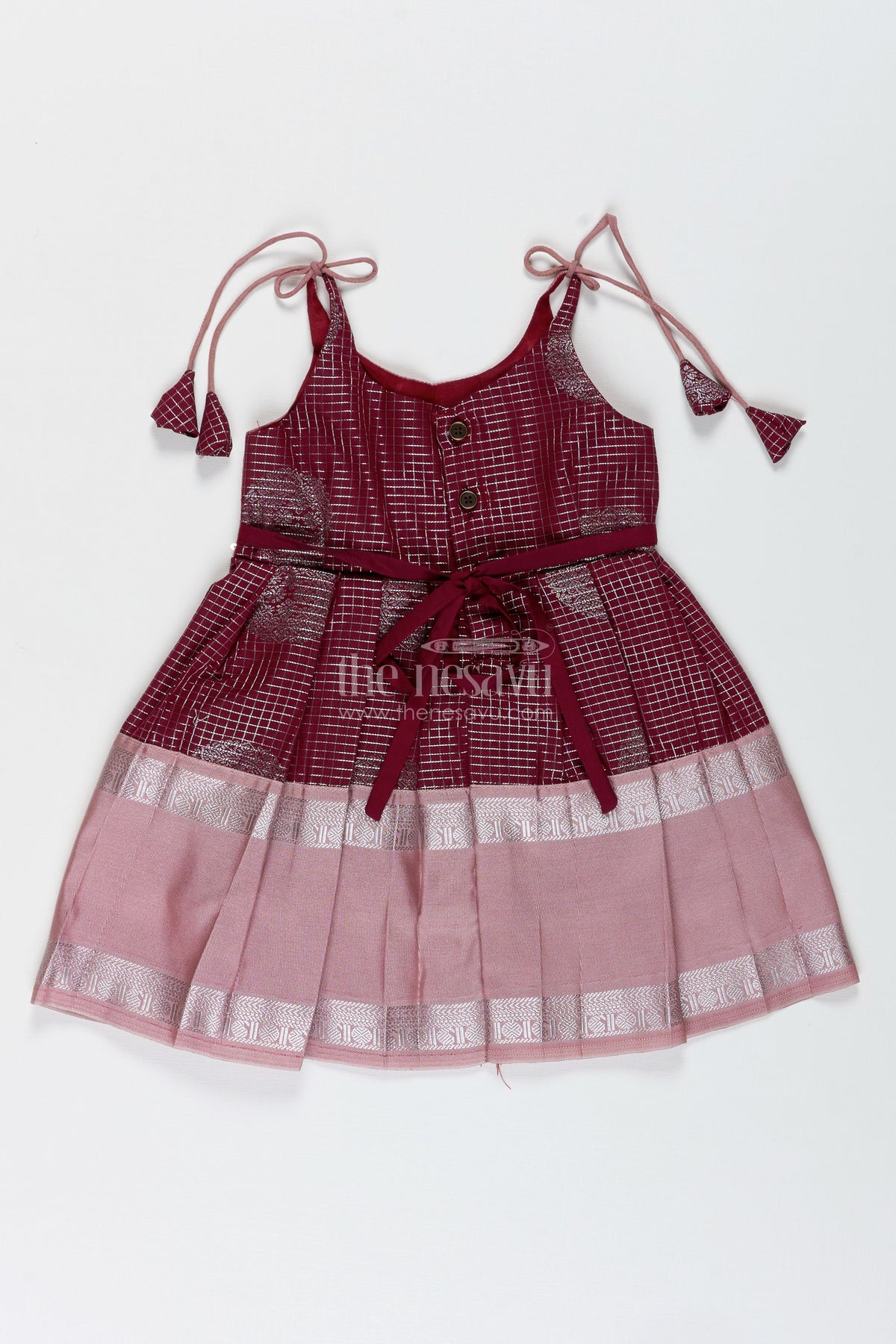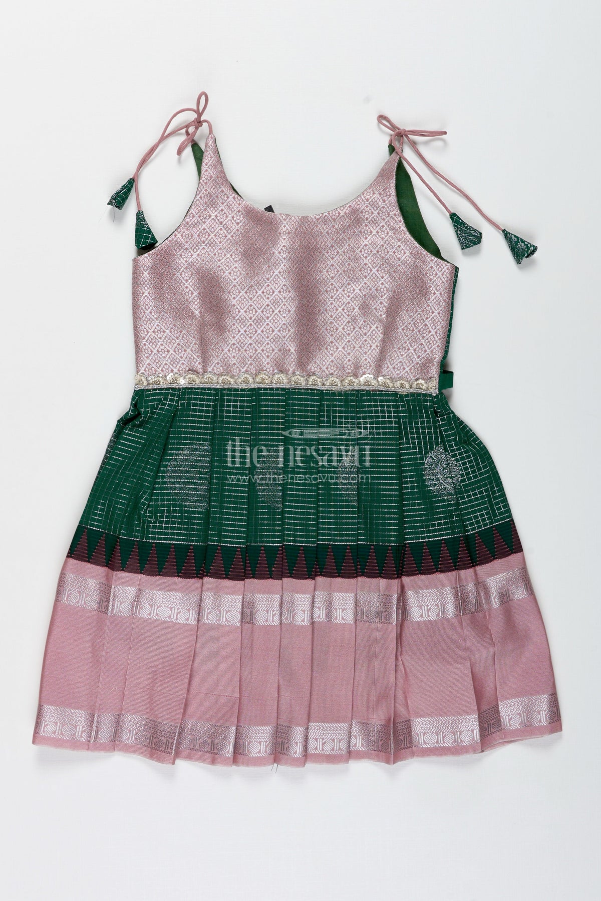 The Nesavu Tie-up Frock Green and Blush Pink Semi Silk Frock for Baby Girls Traditional Festive Outfit Nesavu Nesavu Baby Girl Festive Frock In Green And Blush Pink Semi Silk Dress With Temple Borders
