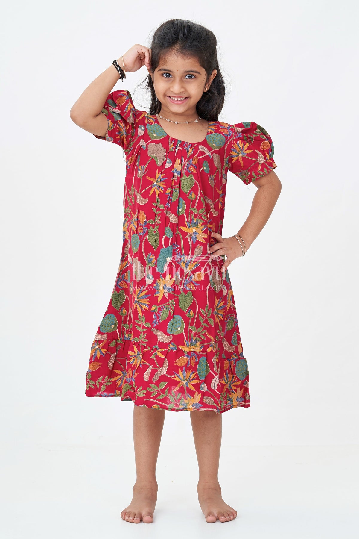 Beautiful party frock in bold floral motifs is a delightful addition to your little girl's wardrobe. Crafted from luxurious modal silk, this dress showcases a vivid digital print on a striking red base, giving it a unique and festive flair. Designed for comfort and movement, the frock features voluminous puff sleeves and a playful flared hem with gentle gathers. It’s perfect for parties or casual outings, blending bright aesthetics with soft, breathable fabric. Whether she's dancing around or enjoying playtime, this frock ensures she does it all in style and ease.