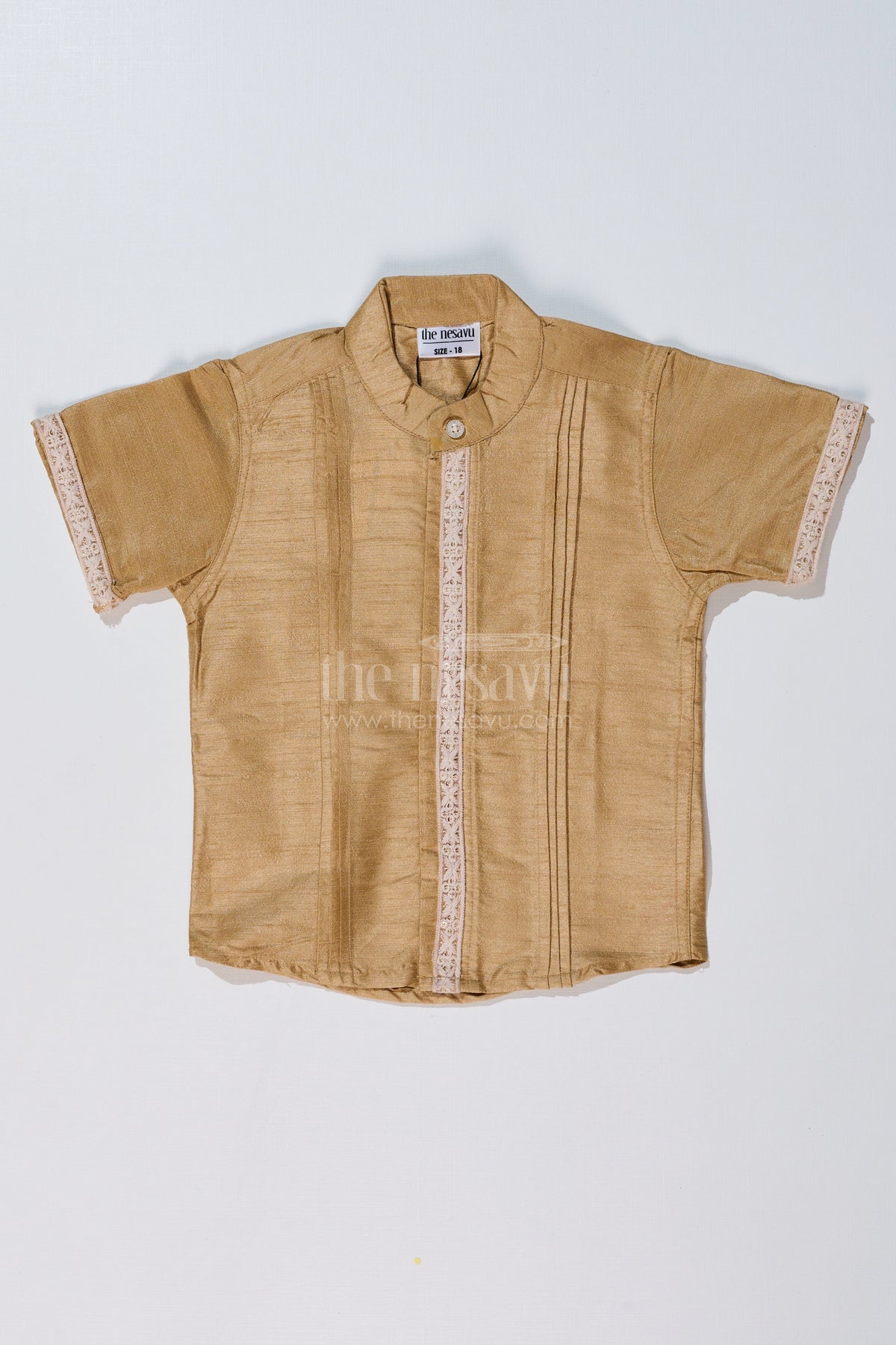 This stylish half shirt is a perfect blend of tradition and comfort, making it a great choice for festive occasions. Crafted from a rich silk blend, it features a subtle sheen that enhances its sophisticated appeal. The neatly stitched pleats on the front, along with intricate lace detailing on the placket and sleeves, add a touch of elegance. The short-sleeved design ensures comfort and ease of movement, making it suitable for long hours of wear. Whether paired with a dhoti for traditional events or trousers for a modern look, this versatile shirt is a must-have in your child's ethnic wardrobe.