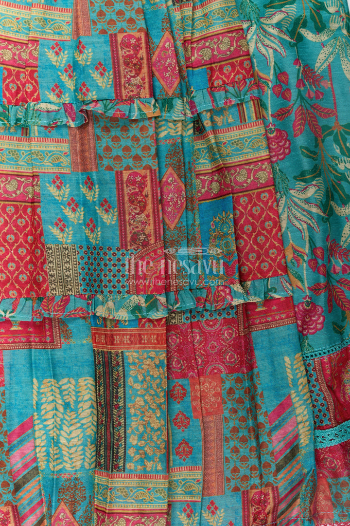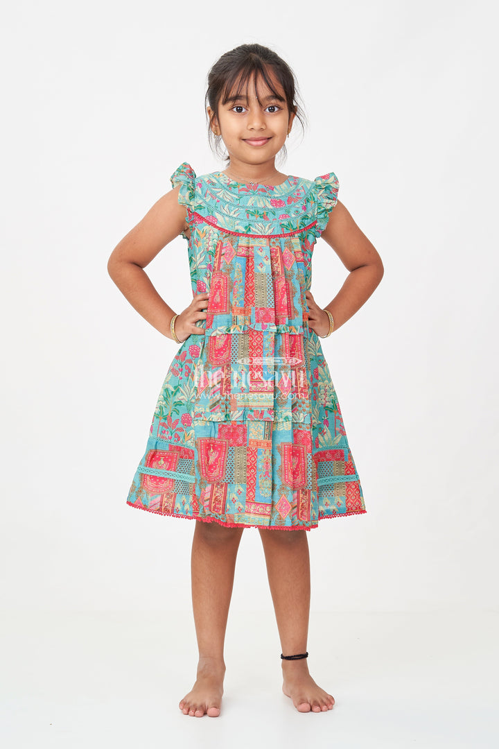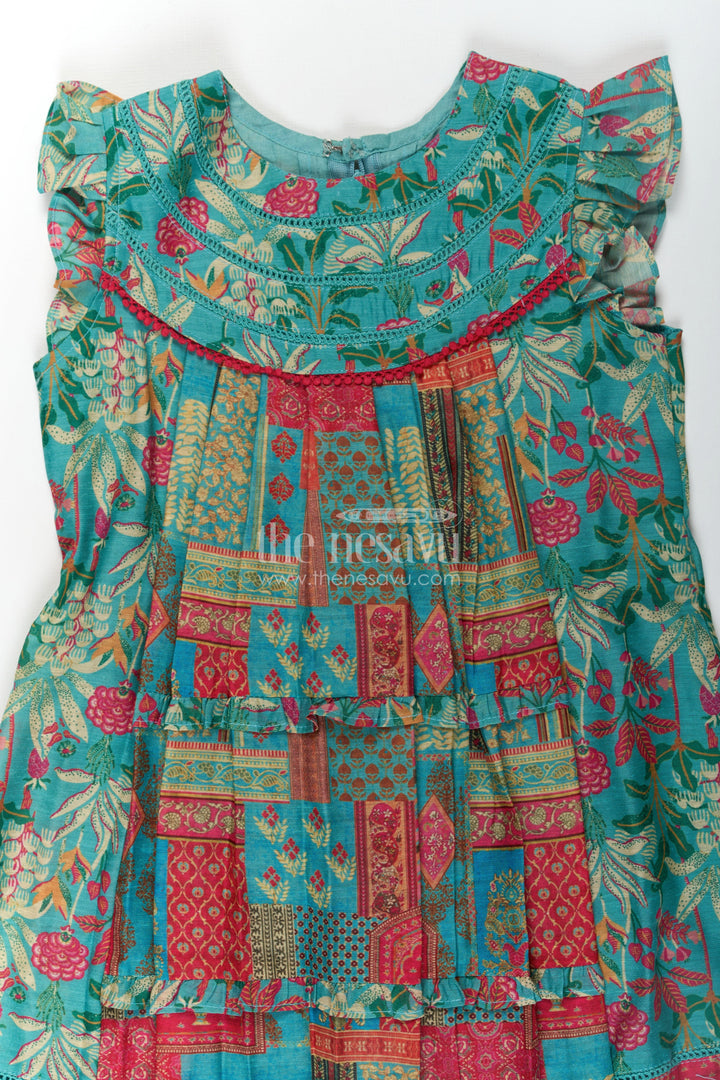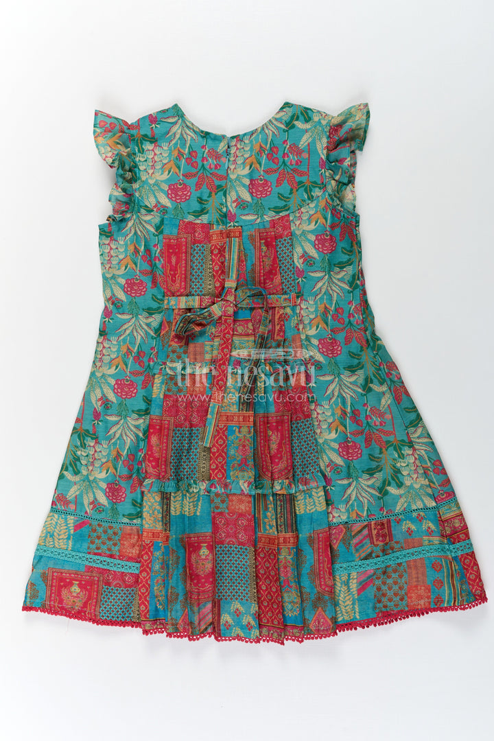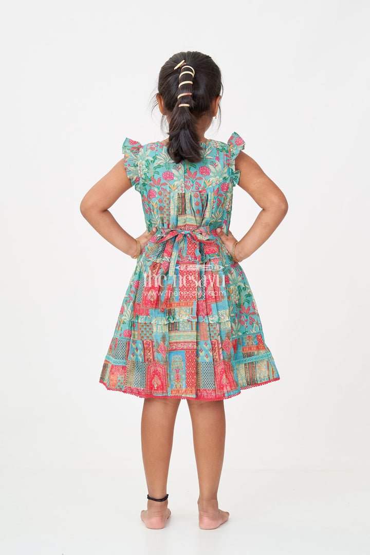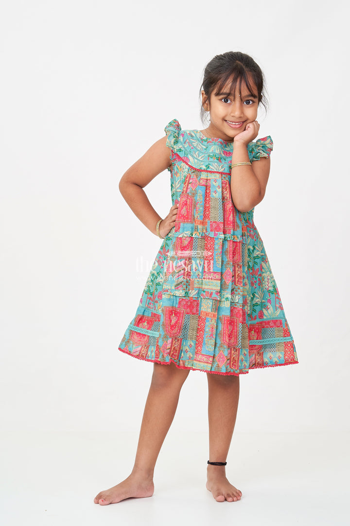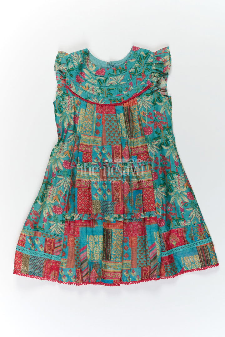 Green color frocks design comes alive in this beautifully detailed girls cotton frock by Nesavu. Crafted from breathable cotton with digital print, this dress features vibrant ethnic patterns in red, mustard, and teal, creating a festive flair. The playful ruffled sleeves and rounded yoke add a touch of charm, while the structured pleats give the frock a graceful flow. It’s the perfect outfit for both casual and festive settings, providing comfort through its airy fabric while remaining visually stunning. The vibrant green base enhanced with intricate multicolor motifs ensures your child stands out in both elegance and cheer.