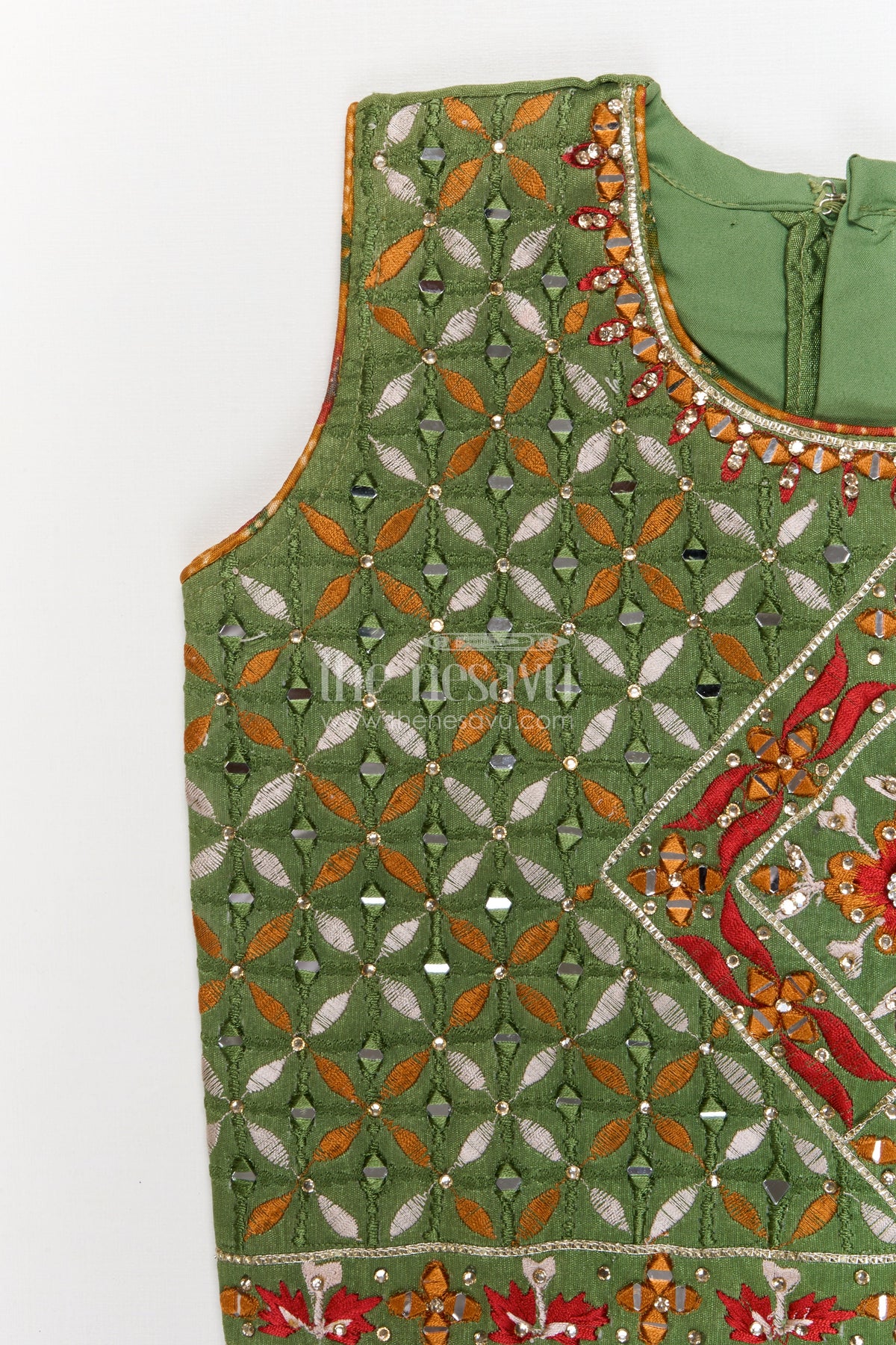 Sleeveless blouse with detailed neckline enhances the ethnic charm