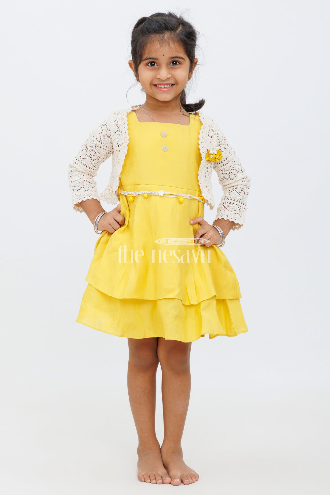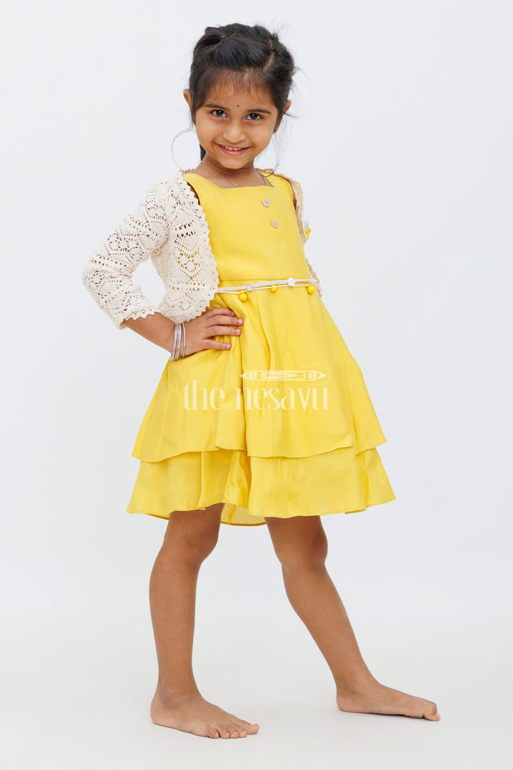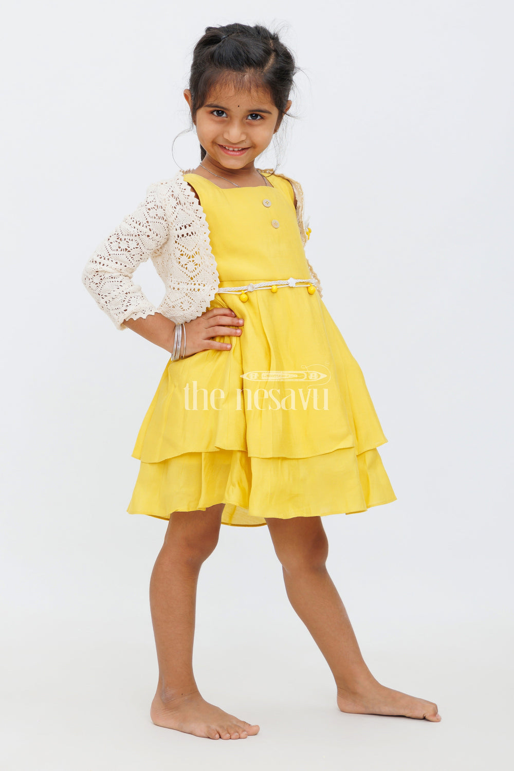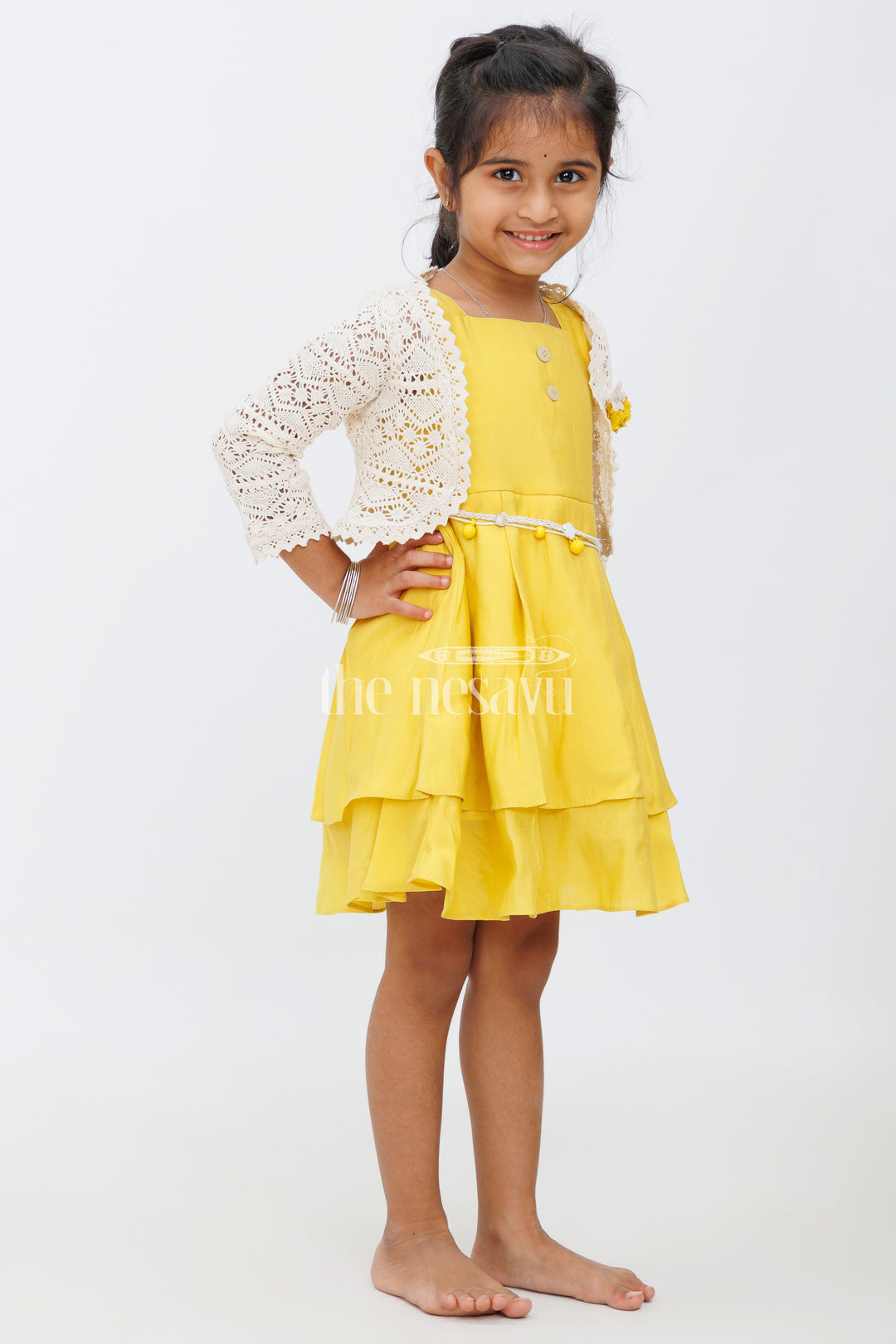 The Nesavu Girls Fancy Frock Girls Mustard Yellow Dress with Layered Skirt and Crochet Button Bolero for Special Events Nesavu 16 (1Y) / Yellow GFC1412A-16 Nesavu Girls Mustard Yellow Dress Layered Skirt Crochet Bolero Special Occasions