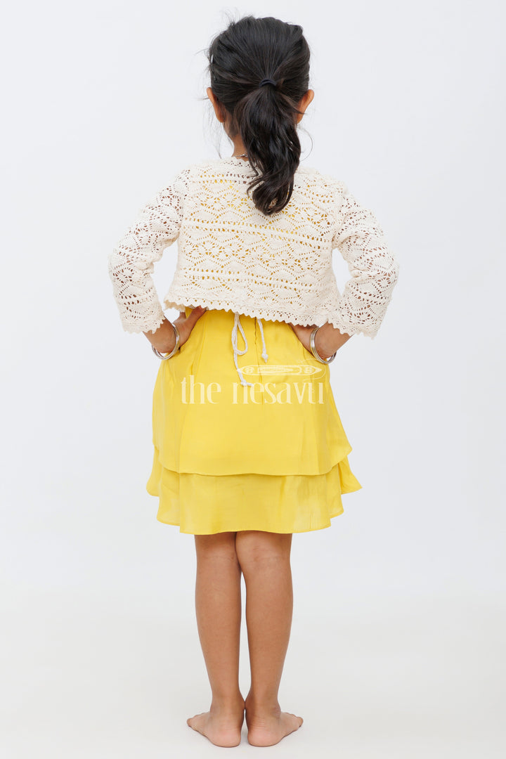 The Nesavu Girls Fancy Frock Girls Mustard Yellow Dress with Layered Skirt and Crochet Button Bolero for Special Events Nesavu Nesavu Girls Mustard Yellow Dress Layered Skirt Crochet Bolero Special Occasions