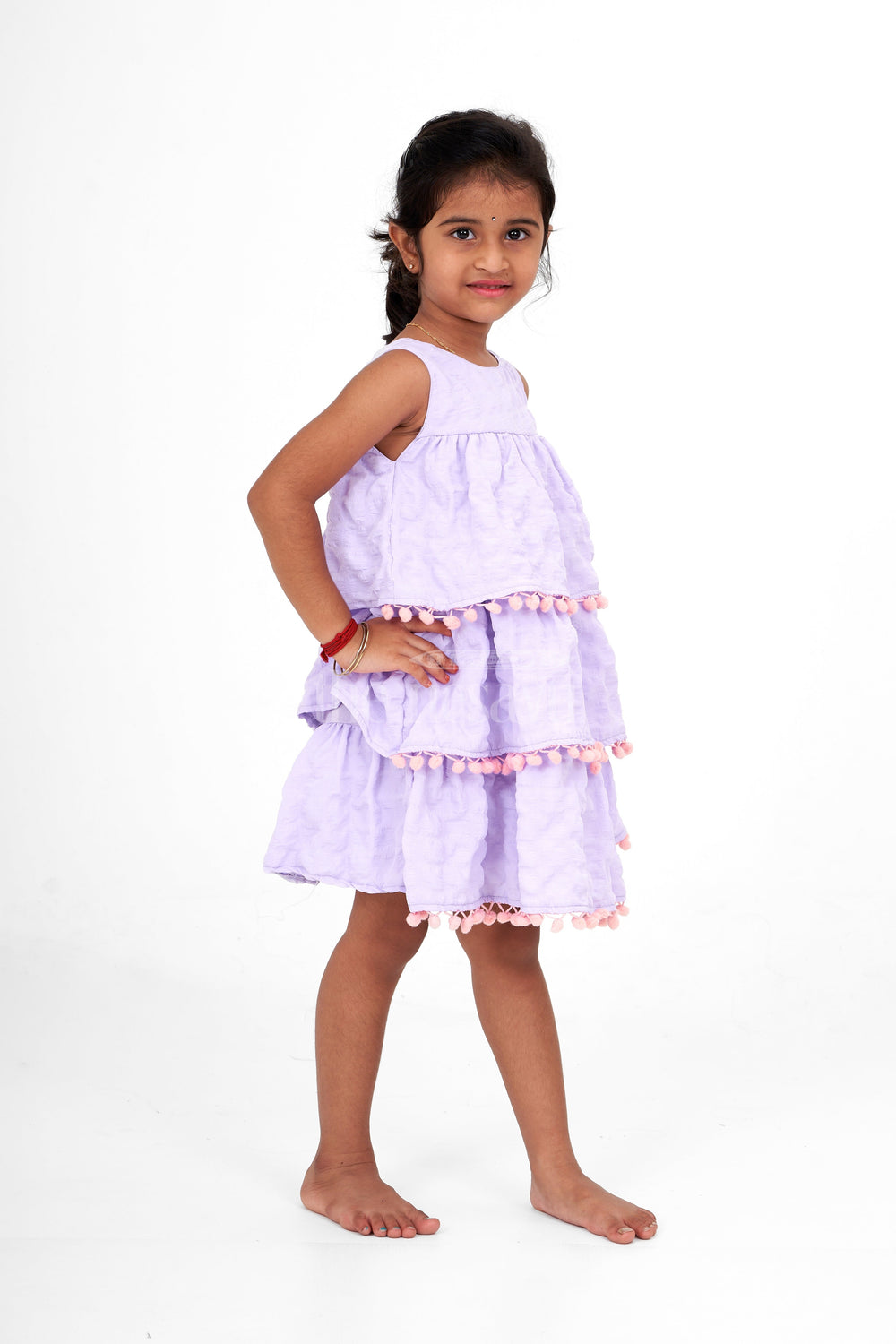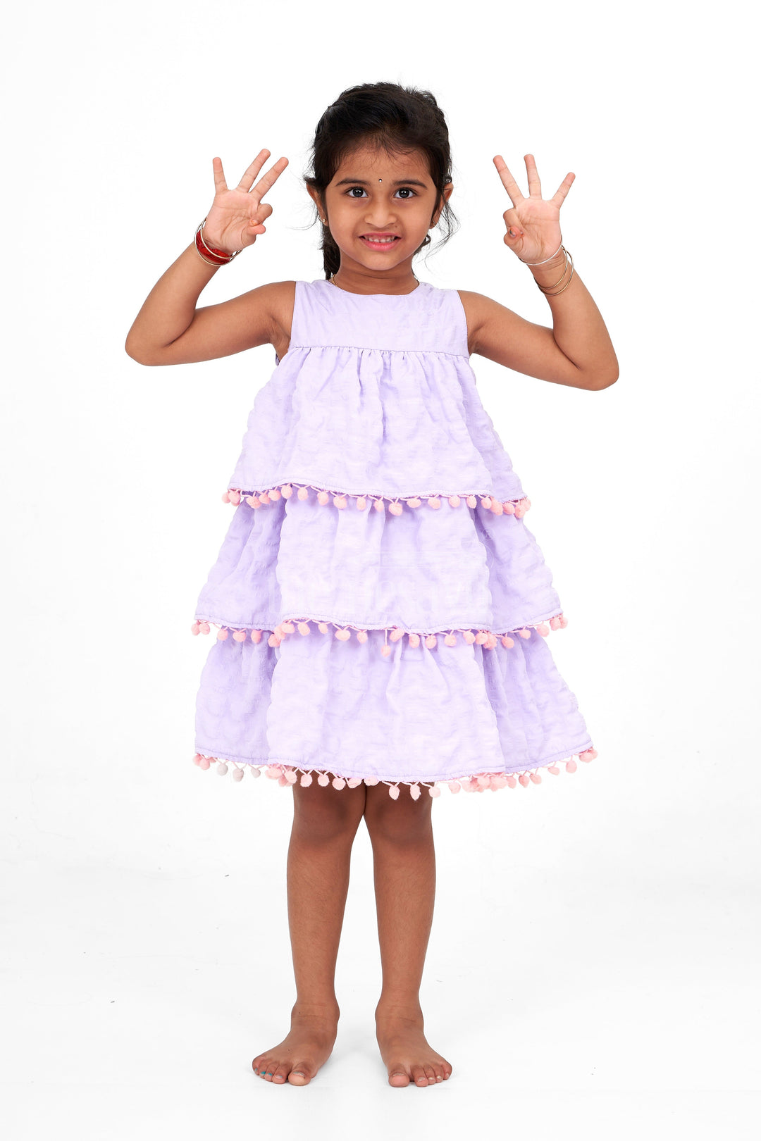 This lilac-tiered dress is a delightful blend of playful design and comfort. The dress features three voluminous tiers, each trimmed with whimsical pink pom-poms, adding a fun visual charm. The textured fabric is lightweight, keeping your little one cool while looking party-ready. Perfect for birthdays, parties, or casual outings, this dress is designed to make your little girl feel special. The sleeveless design ensures comfort in warmer weather, while the tiered layers give the dress a bouncy, twirl-worthy feel ideal for making any occasion feel festive!
