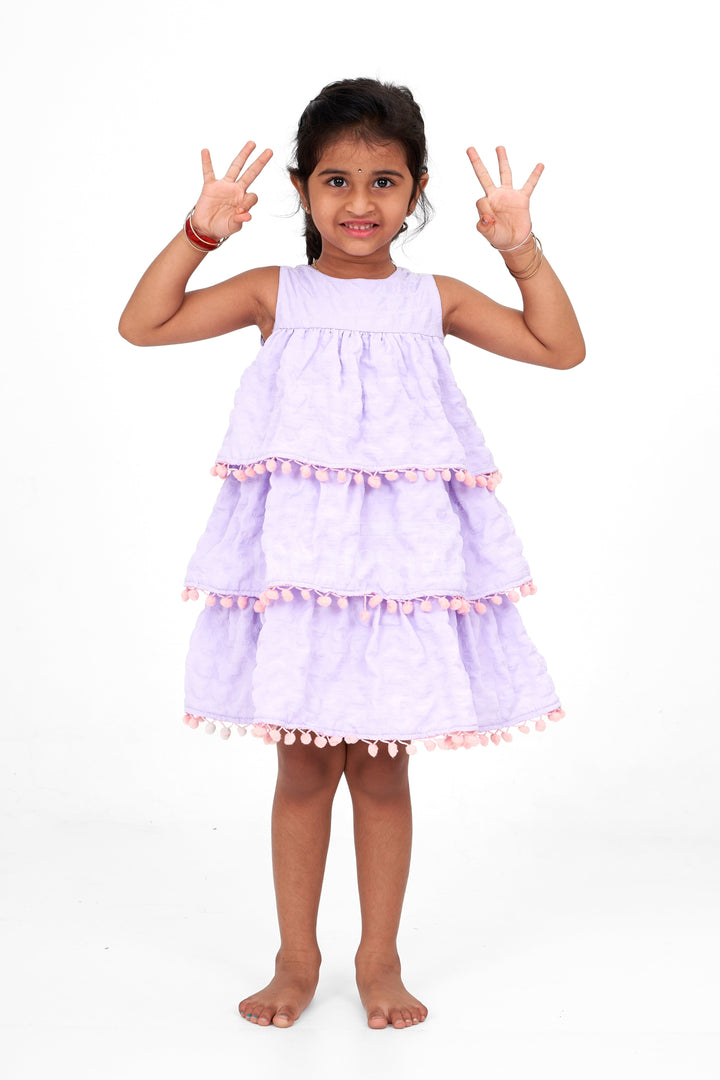 Lilac-Tiered Girls Fancy Frock with Pom-Pom Trim and Sleeveless Design for Parties