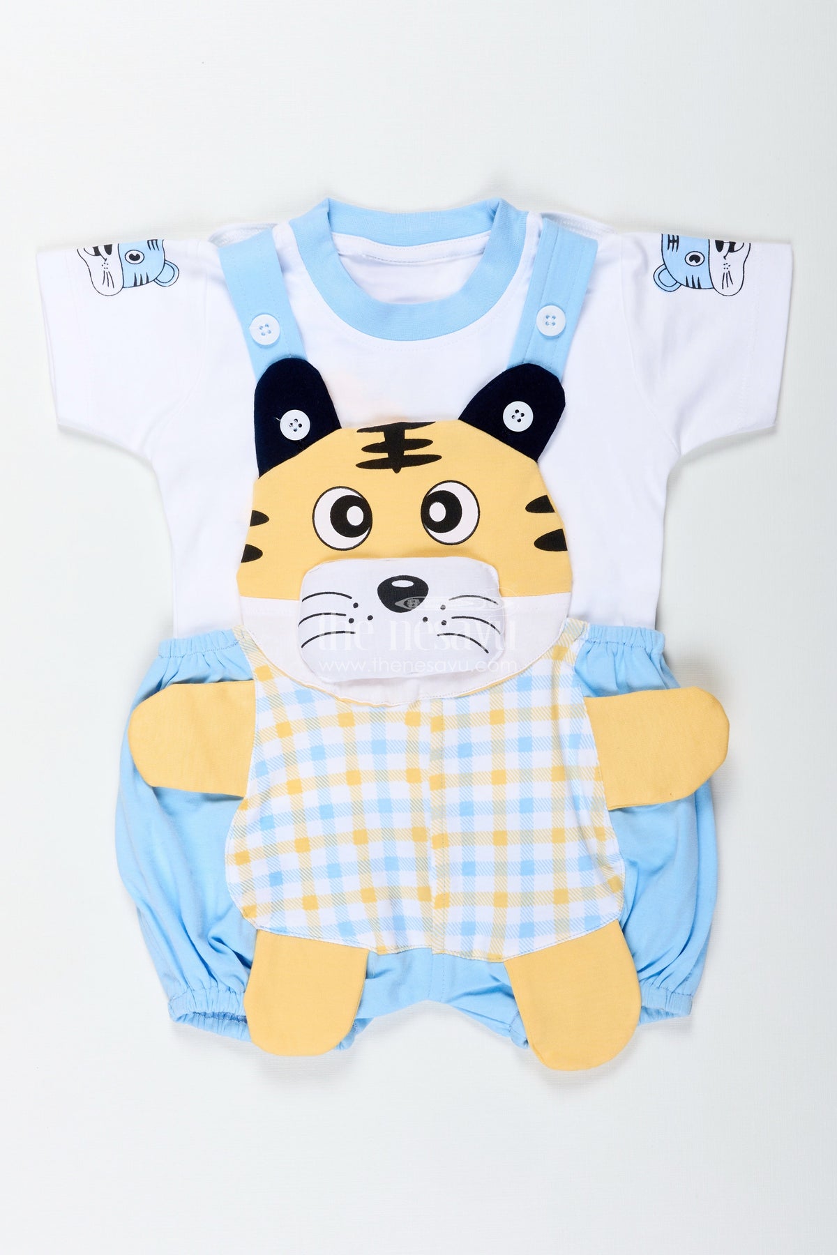 Tiger design shirt brings together charm and functionality in one irresistibly cute cotton outfit for baby boys. Featuring a blue and yellow check dungaree with a tiger face embroidery, this set includes a soft white tee that complements the colorful design. The breathable fabric ensures day-long comfort, while the playful animal embroidery adds personality to the outfit. Designed for convenience, the outfit comes with easy-to-use snap closures and adjustable straps. Whether you're out for a walk or playing indoors, this outfit keeps your child cozy, cool, and photo-ready.