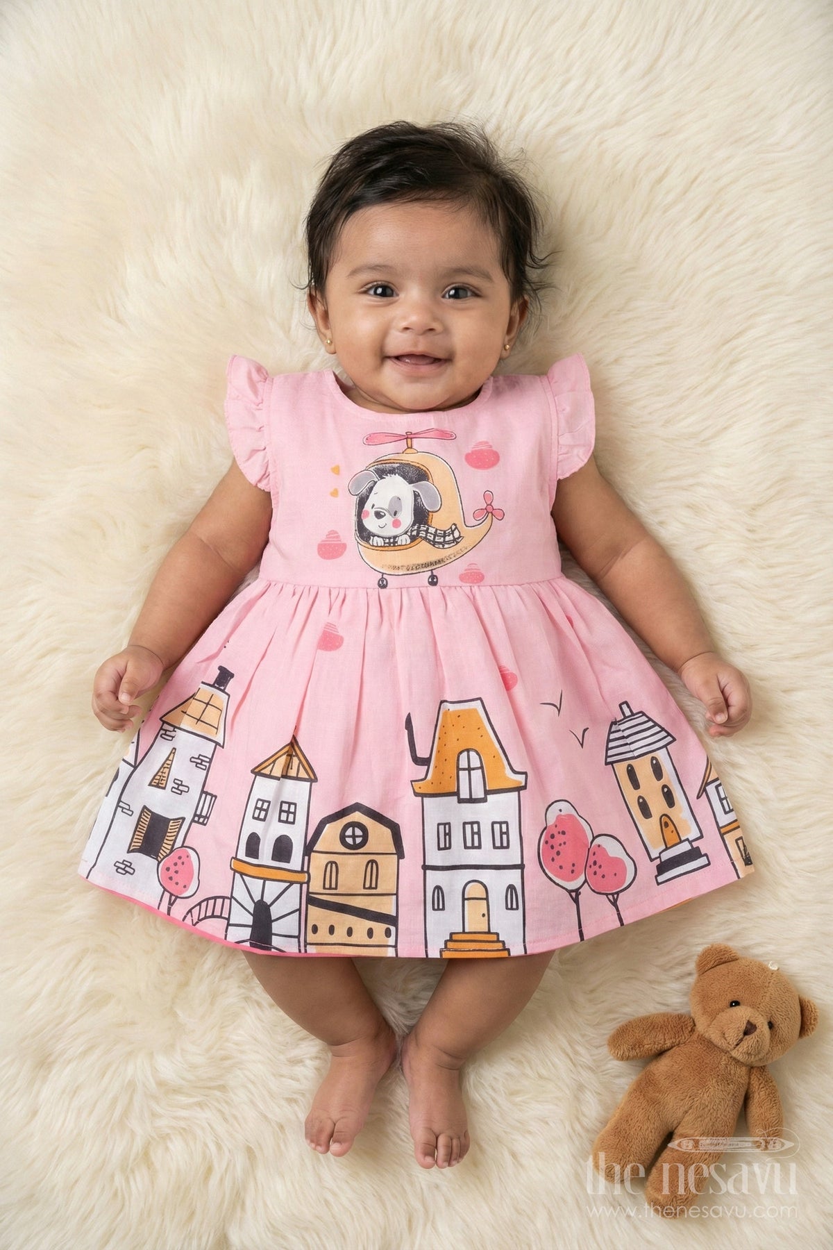 The Nesavu Baby Cotton Frocks Baby Girl Cartoon Print Cotton Frock with Frills for Everyday Charm Nesavu Nesavu baby girl frock with puppy helicopter and cartoon house digital print