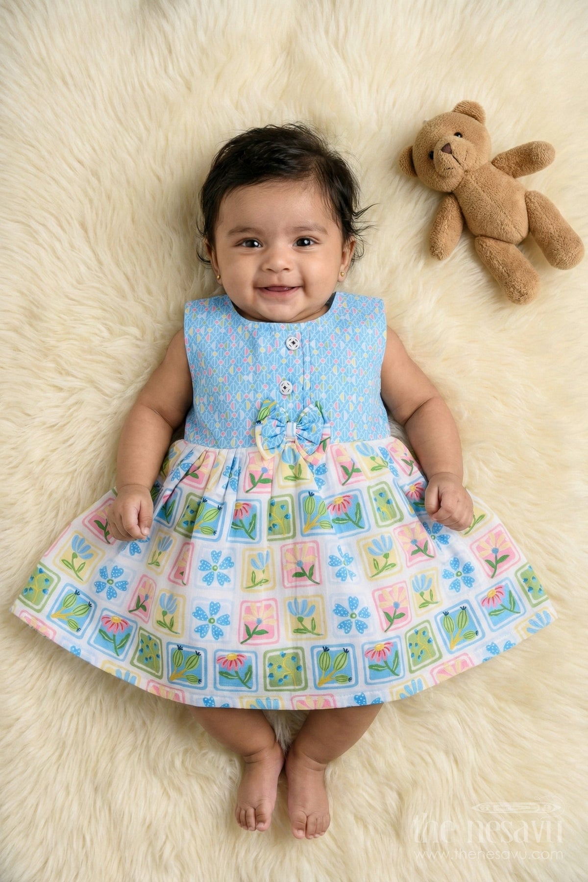 The Nesavu Baby Cotton Frocks Toddler Girl Cotton Frock with Cartoon Characters and Fruits Digital Print Nesavu 14 (6M) / Blue BFJ898B-14 Nesavu toddler girl digital print cotton frock with fruits and cartoon characters
