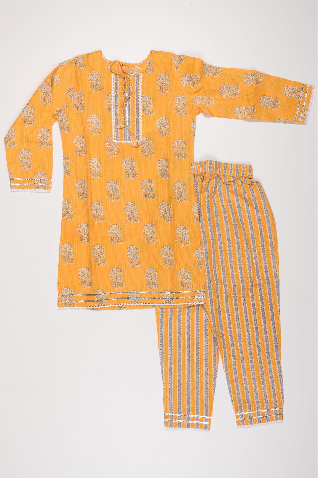 - Set Includes: One mustard yellow kurti, striped pants, and a dupatta