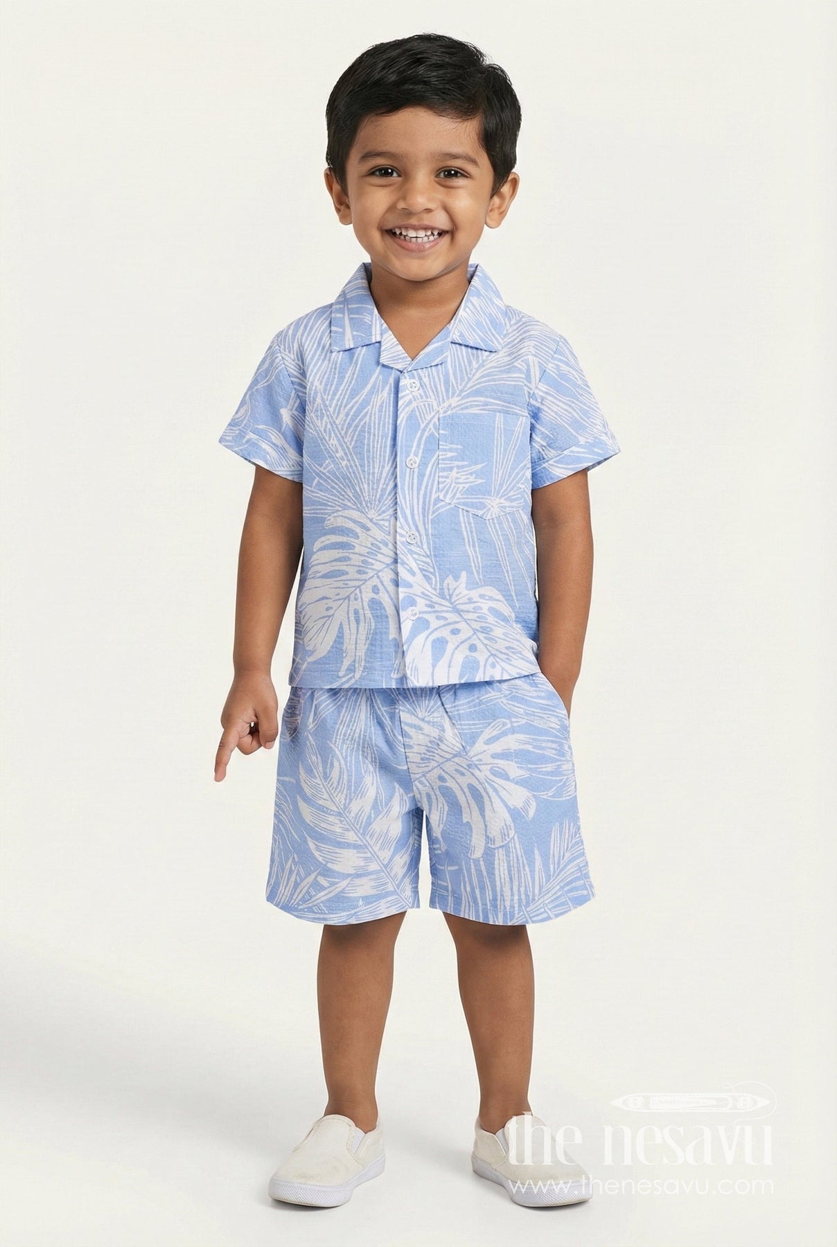 The Nesavu Boys Casual Set Boys Cotton Co-Ord Set with Leaf Print for Summer Play and Holidays Nesavu 16 (1Y) / Blue BCS480B-16 Nesavu boys cotton co-ord set tropical print  perfect summer outings holidays
