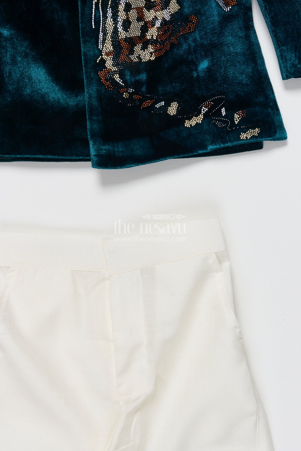 • This boys velvet sherwani set with stone work adds a regal touch to special celebrations