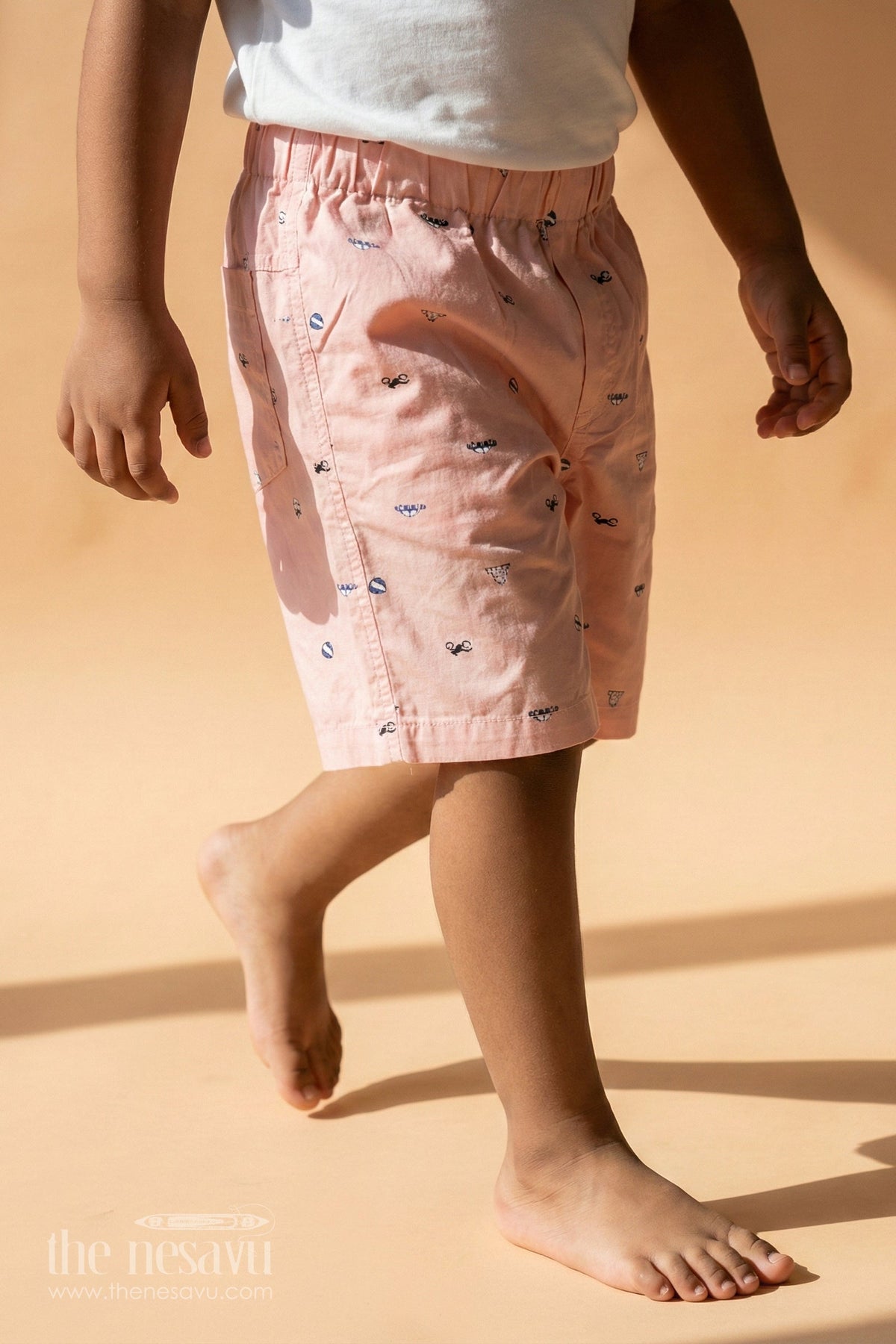 These summer shorts shorts for boys are a warm-weather essential, designed in a soft pink shade and printed with playful sunglasses, hats, and beach icons. Made from breathable cotton with all over digital print, they provide maximum comfort and mobility for active little ones. The soft elastic waistband ensures a snug fit without restricting movement, making them perfect for playdates, holidays, or relaxing at home. Lightweight and cheerful, these shorts add a breezy beach vibe to any outfit while keeping your child cool and stylish all day long.