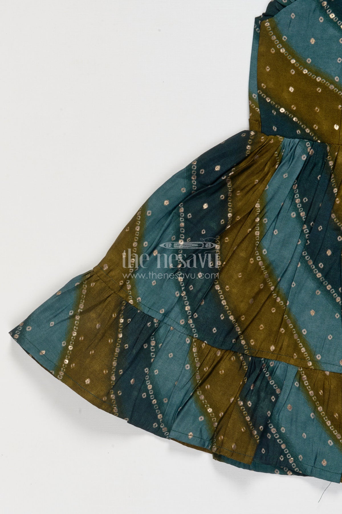 - Design: Ethnic-inspired print, flared hem, ruched neckline