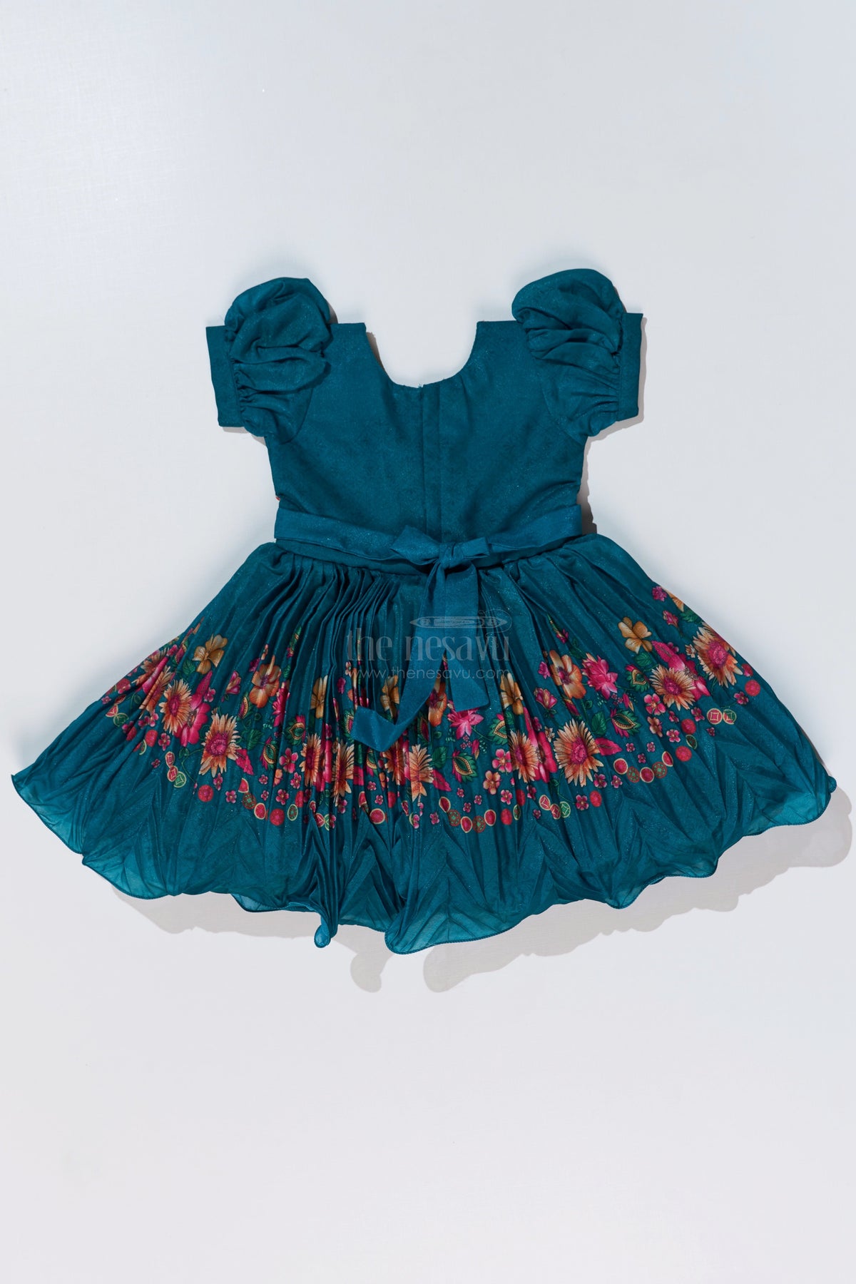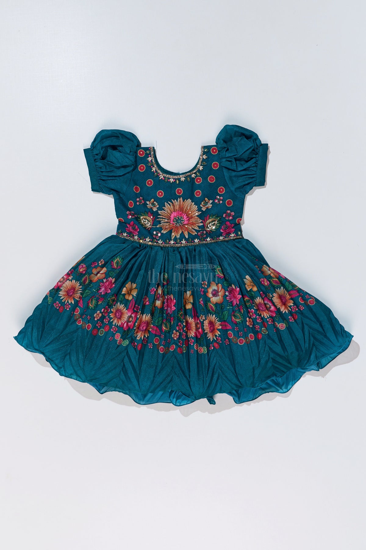 This aesthetic traditional dress is a timeless choice for special occasions. Designed with a rich floral digital print on Chinon fabric, this dress showcases exquisite embroidery on the bodice, enhancing its regal appeal. The deep green shade complements the vibrant floral motifs, creating a stunning contrast. The structured puff sleeves add an elegant touch, while the pleated skirt gives a graceful flow to the dress. Ideal for traditional events, festive gatherings, or cultural celebrations, this outfit ensures a blend of comfort and elegance for your little one.