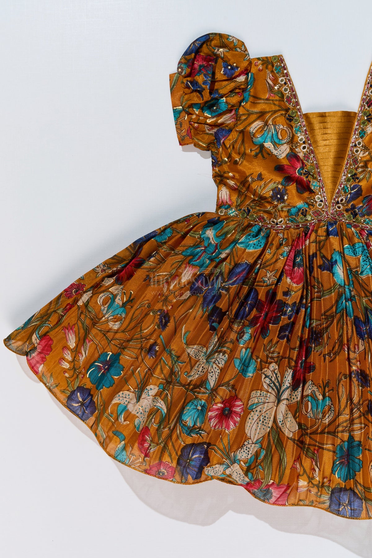 This enchanting short Anarkali frock is designed to bring a touch of grandeur to any special occasion. Featuring a vibrant Chinon digital floral print, this frock showcases a rich color palette that is both eye-catching and elegant. The deep V-neckline is beautifully embellished, while the puff sleeves add a regal touch. The flared skirt creates a flowy silhouette, making it ideal for twirling at weddings, festive gatherings, or cultural celebrations. Crafted from lightweight and breathable fabric, this dress ensures comfort without compromising on style.