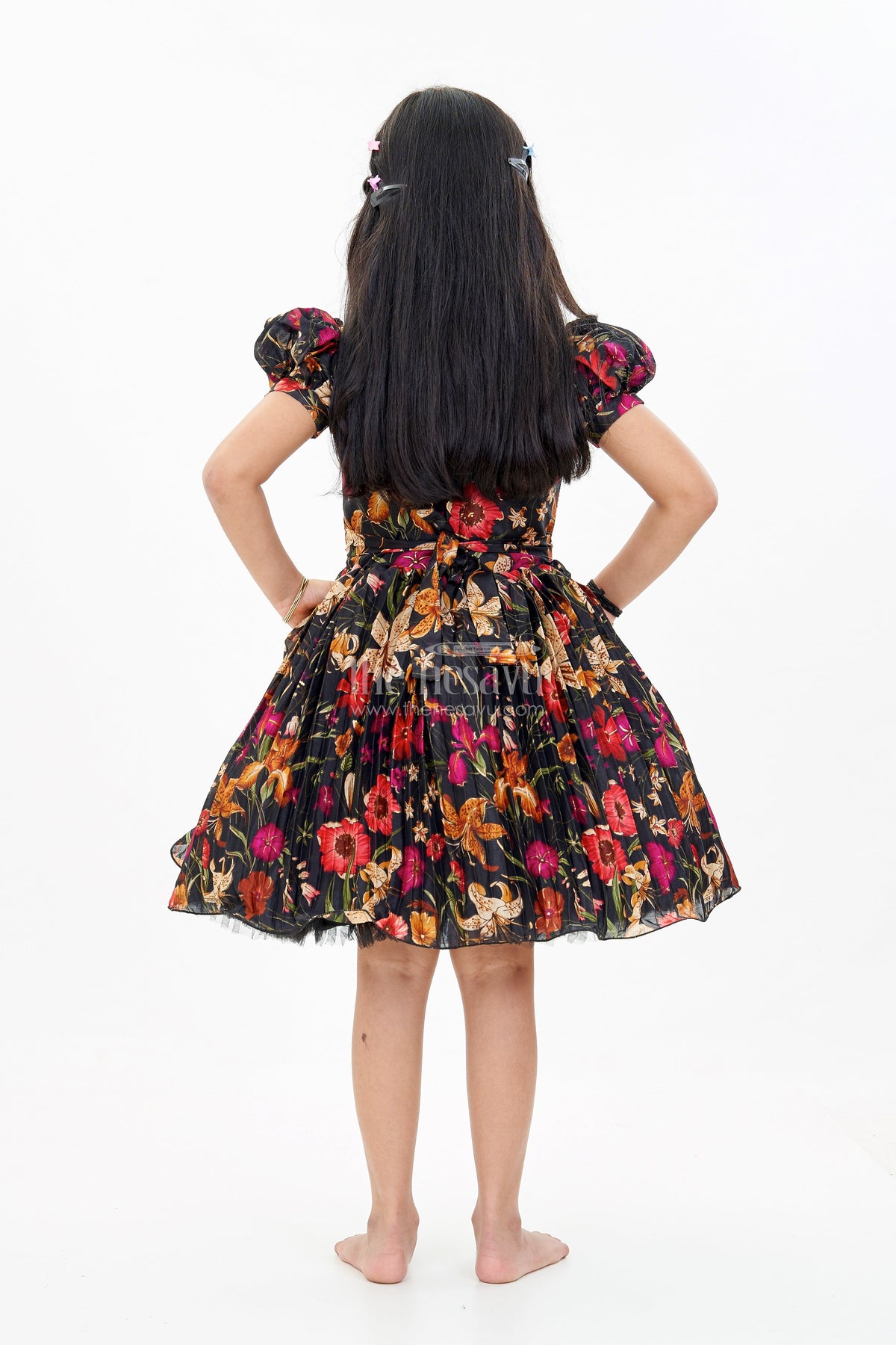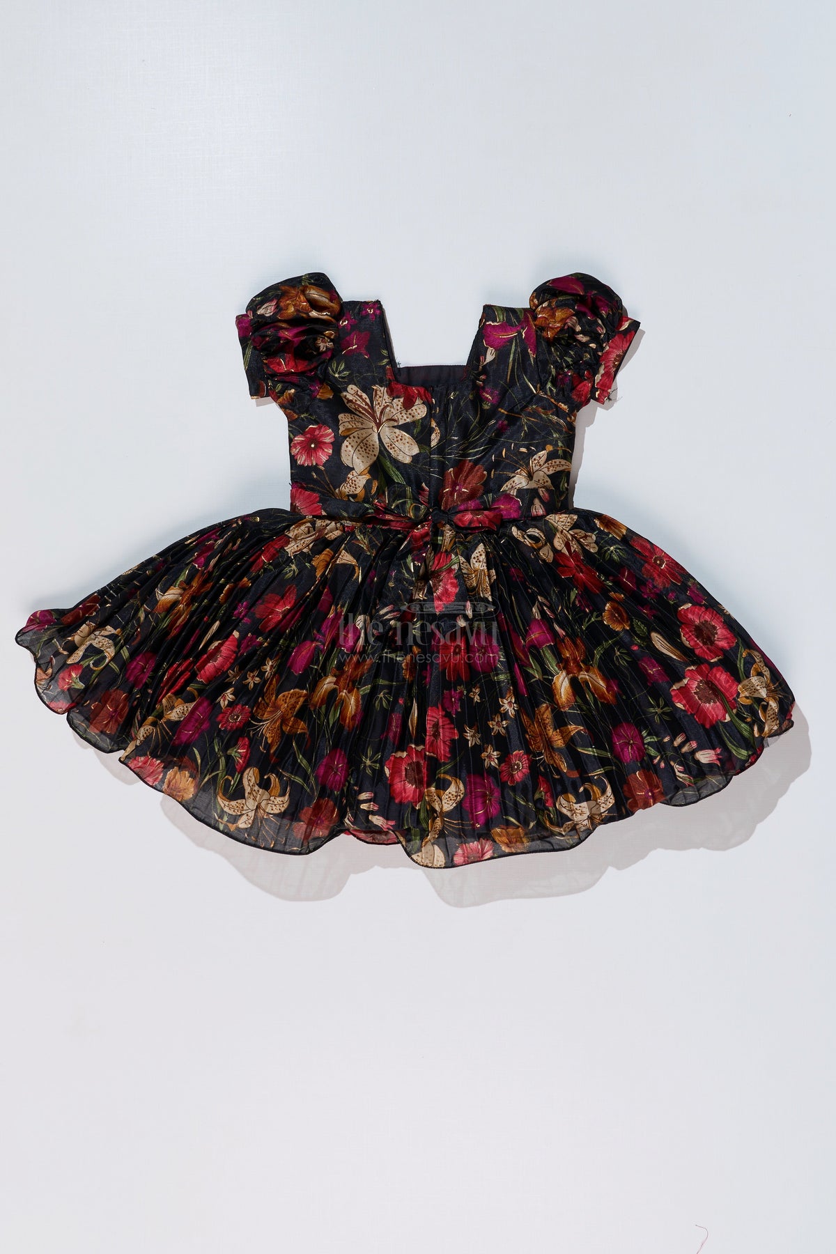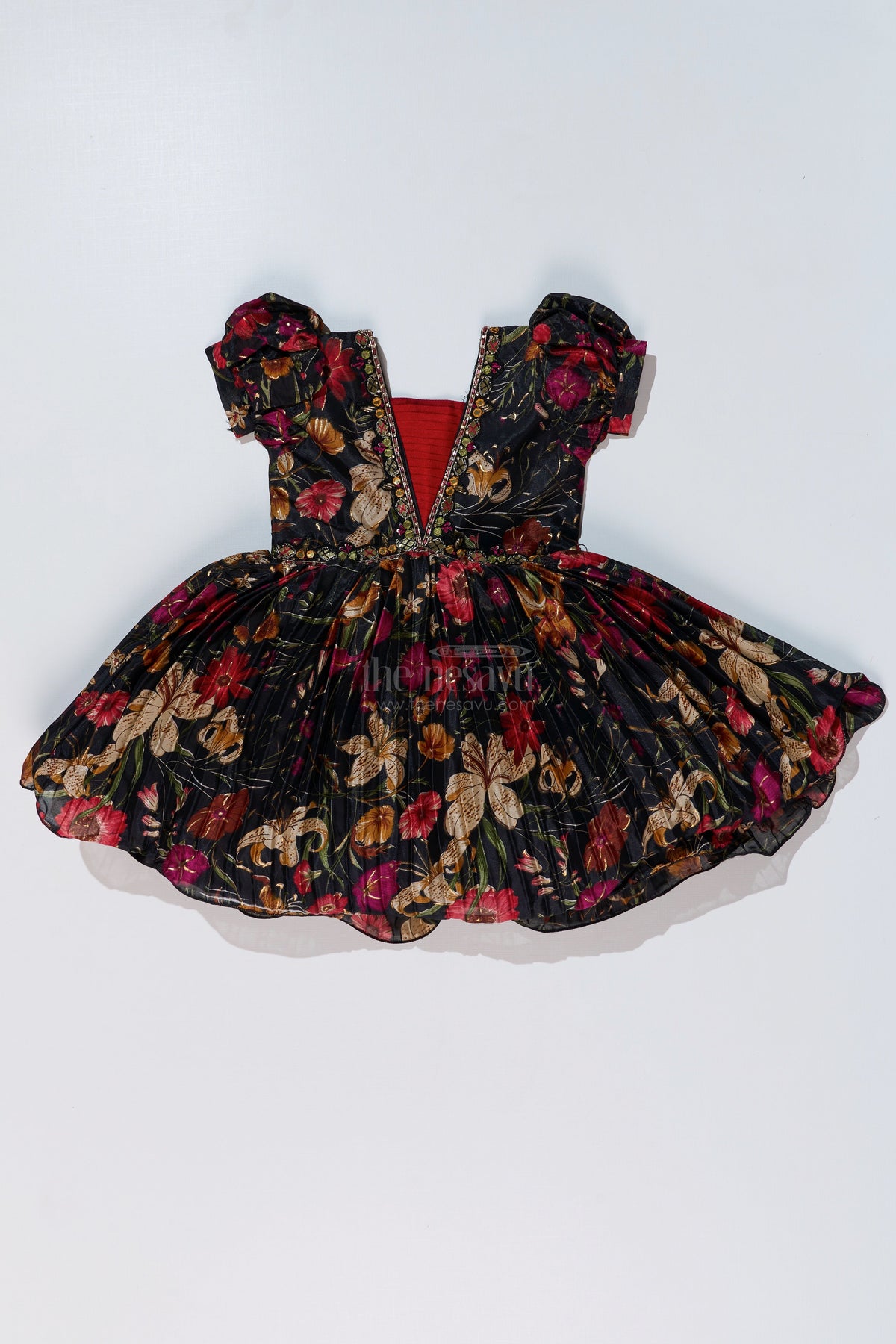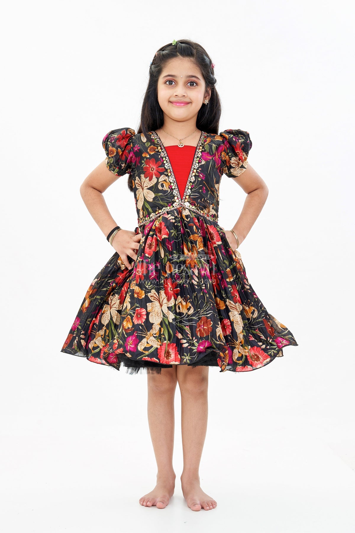 This gorgeous silk kapde ki frock is a perfect choice for festive occasions and parties. Made from premium Chinon digital print fabric, this dress features an elegant floral print on a dark base, creating a striking contrast. The deep V-neckline is adorned with intricate embellishments, adding a luxurious touch to the outfit. The puff sleeves and flared pleated skirt enhance its regal charm, making it an excellent pick for traditional gatherings or stylish celebrations. The lightweight, breathable fabric ensures all-day comfort while maintaining a rich and festive look.