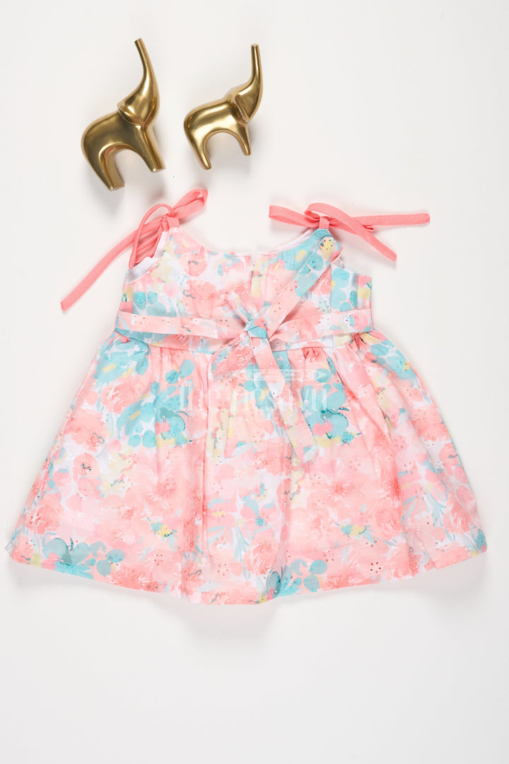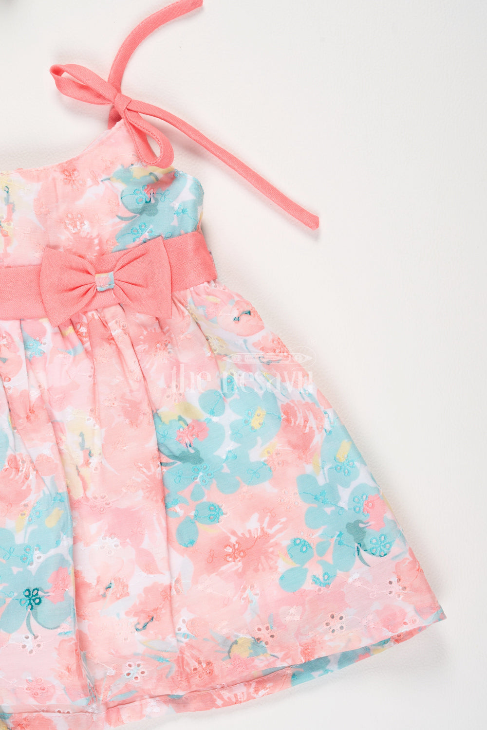 Peach Floral Digital Printed Tieup Frock with Bow Detail for Girls
