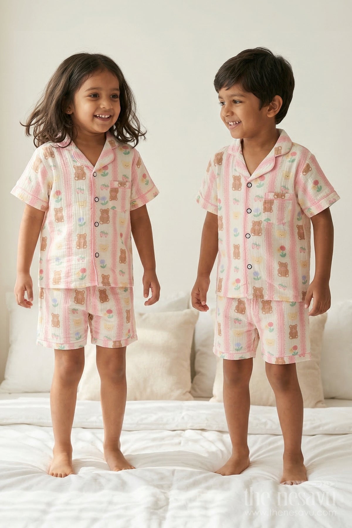 - This kids cotton night suit with teddy print is designed to make bedtime soft and cheerful