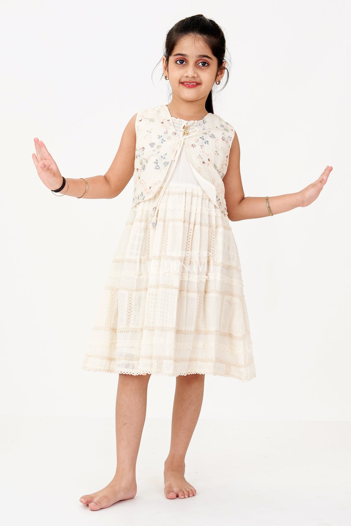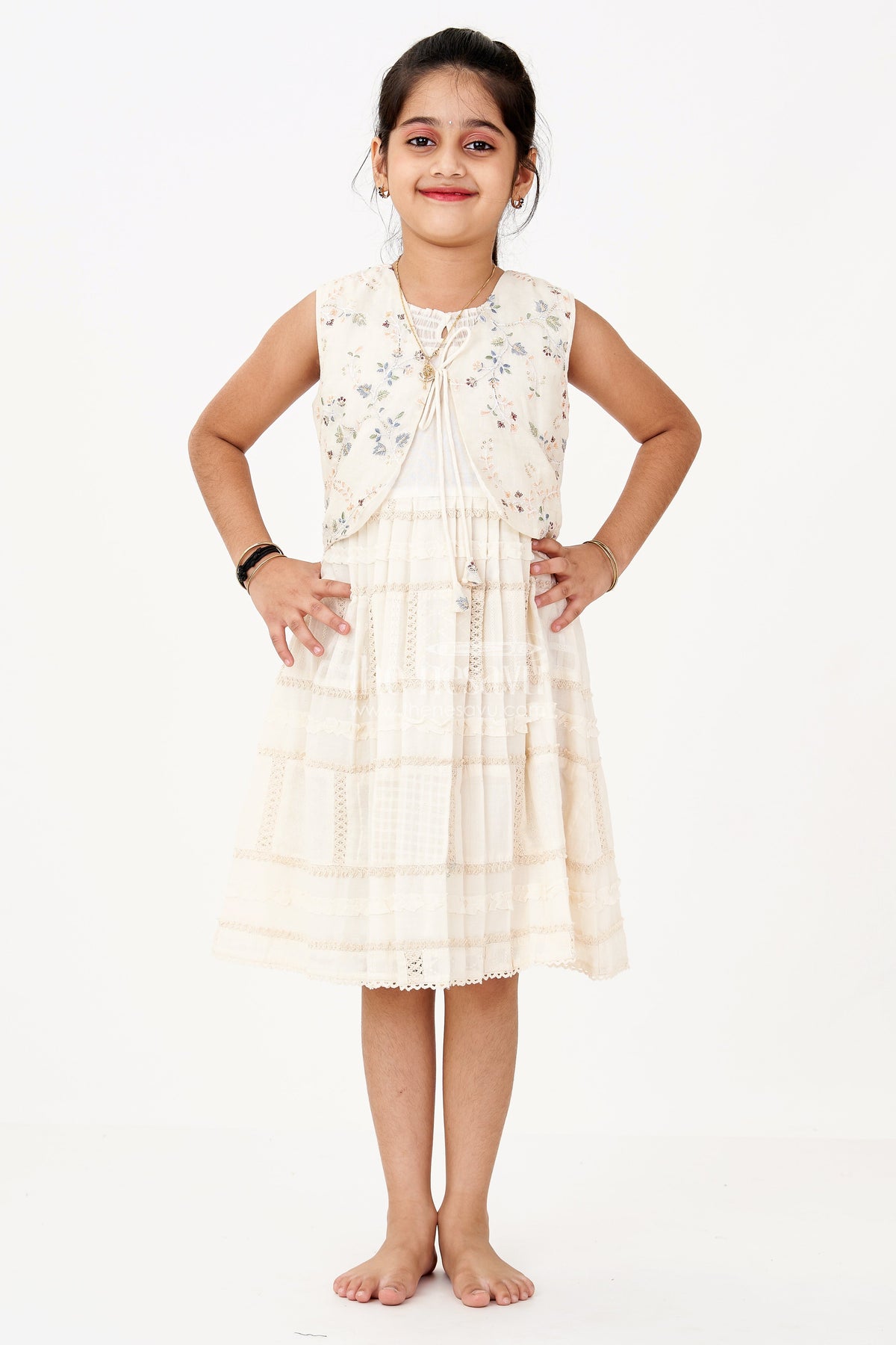 This enchanting white color frock is a delicate blend of elegance and comfort, designed for your little one’s graceful moments. Crafted from soft cotton, the dress features an intricately embroidered yoke with subtle floral patterns, adding a timeless charm. The layered pleated skirt with lace details enhances its feminine appeal, making it an excellent choice for weddings, festive gatherings, or family outings. The attached embroidered jacket provides a unique and sophisticated touch. Designed with a sleeveless silhouette and a tie-up neckline, this dress ensures ease of movement while maintaining a stylish look. Lightweight and breathable, it is perfect for all-day comfort.