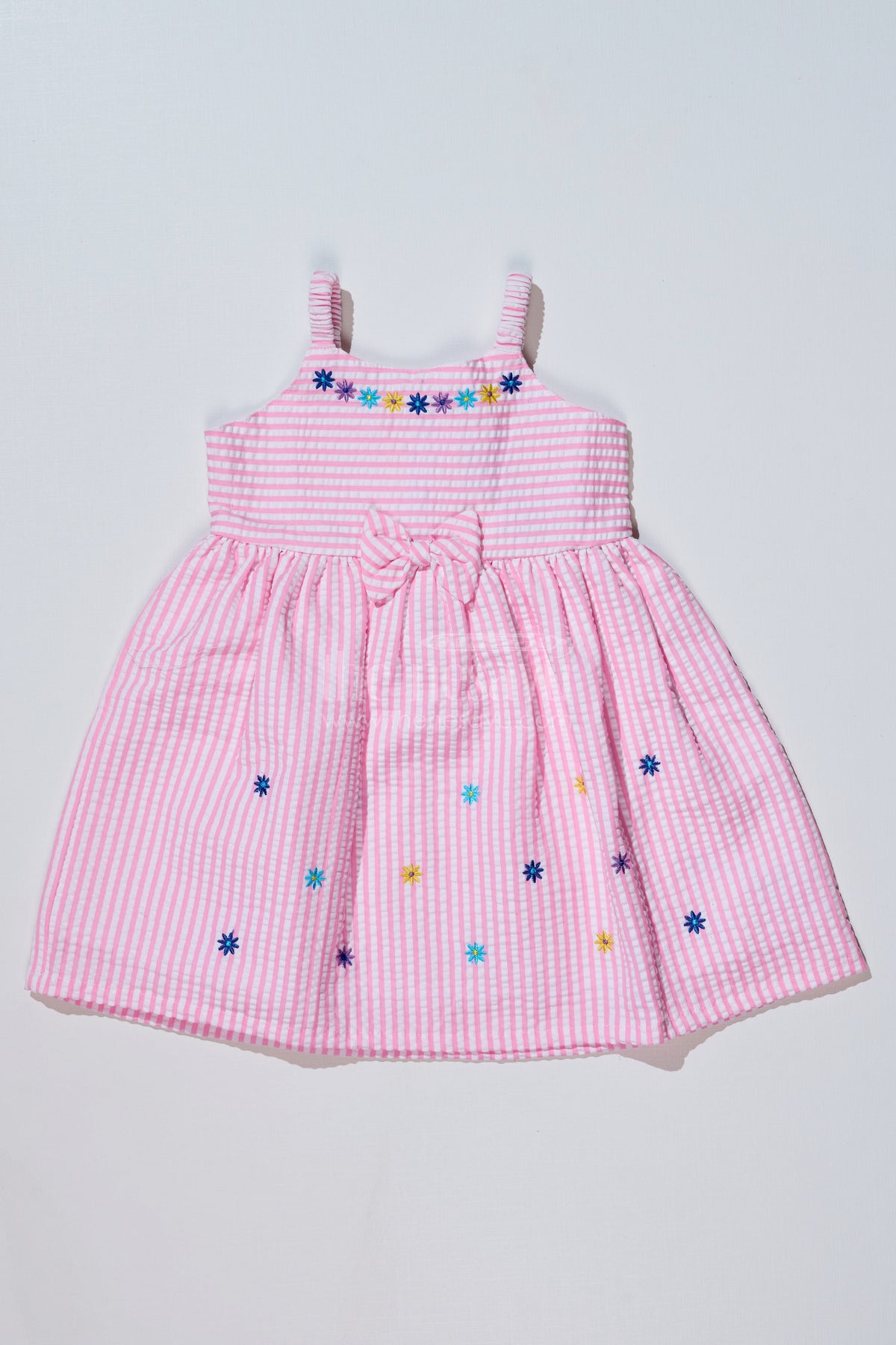 This delightful pink cotton frock is designed for little girls who love a sweet and stylish look. Made from seer sucker cotton, this frock features vibrant floral embroidery spread across the fabric, creating a lively and playful appearance. The smocked bodice with a bow detail adds a touch of elegance, while the breathable cotton material keeps your child comfortable all day. Perfect for summer outings, birthday parties, and casual wear, this dress pairs beautifully with cute sandals or sneakers.