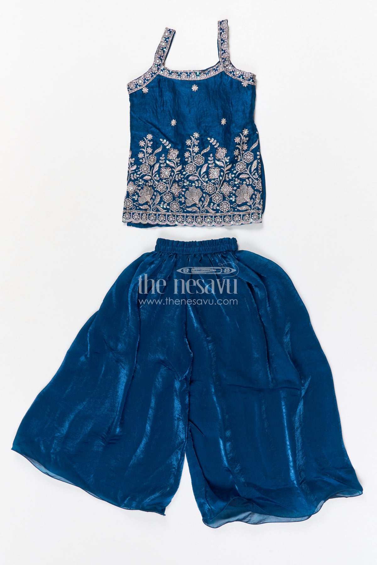 - Wide flared sharara pants add volume and beautiful movement