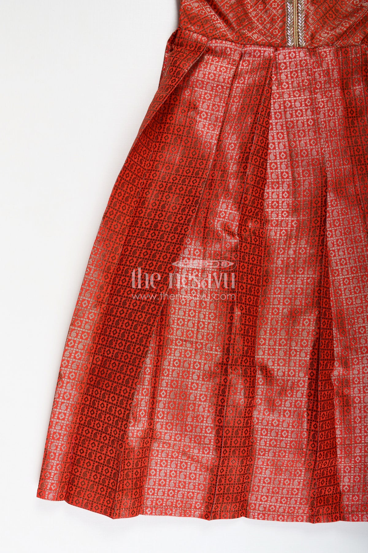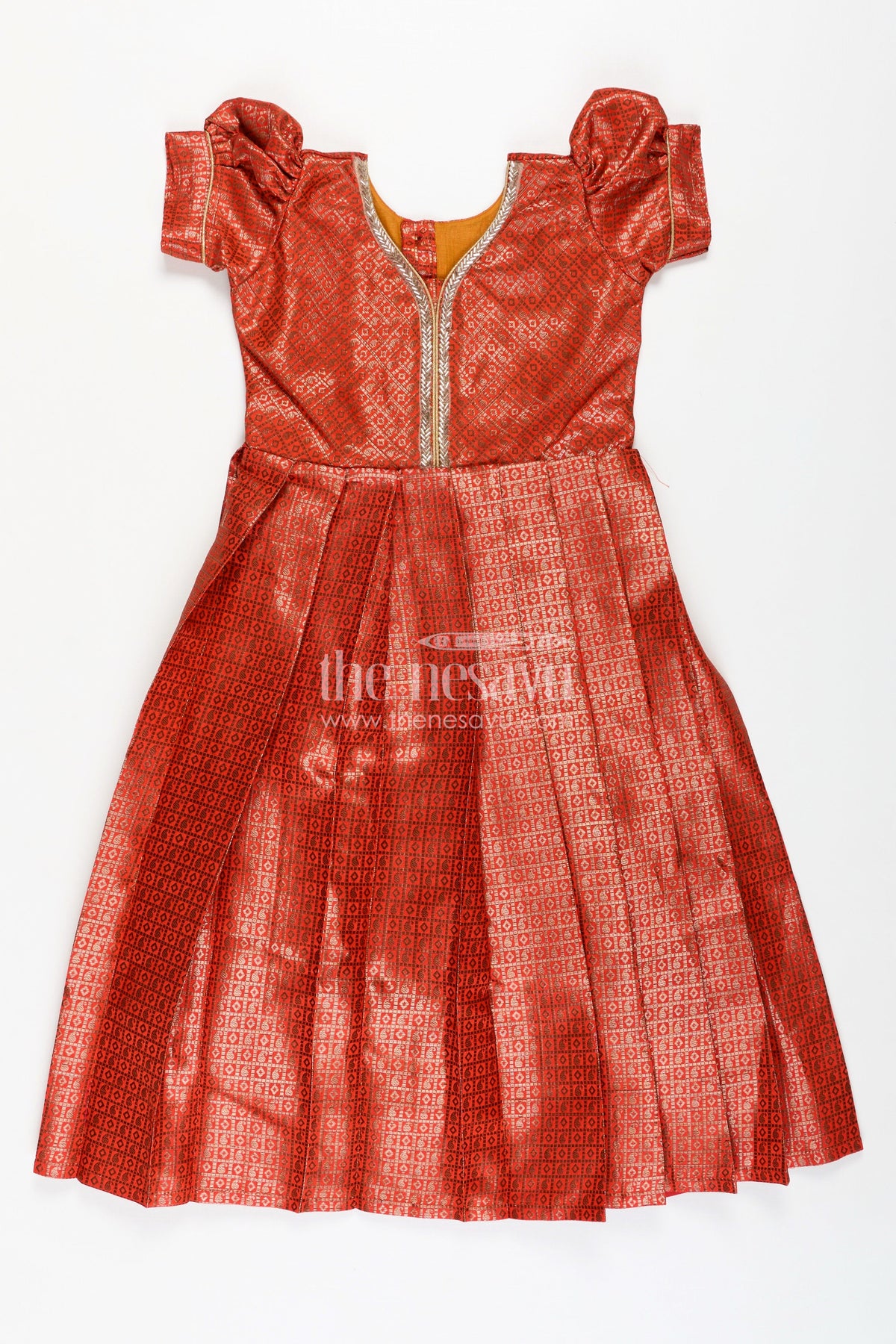 Anarkali dress design is reimagined in this rust-orange girls gown crafted from rich semi Banaras silk. The gown features intricate zari weaving all over, creating a majestic texture that’s ideal for festive and cultural events. With puff sleeves and golden piping at the neckline, the design maintains traditional grace while offering comfort and ease of wear. The flared pleated skirt brings volume and flow, perfect for celebrations that demand style with movement. Lined for comfort and finished with a back zip, this gown brings elegance, ease, and tradition together in one versatile silhouette.