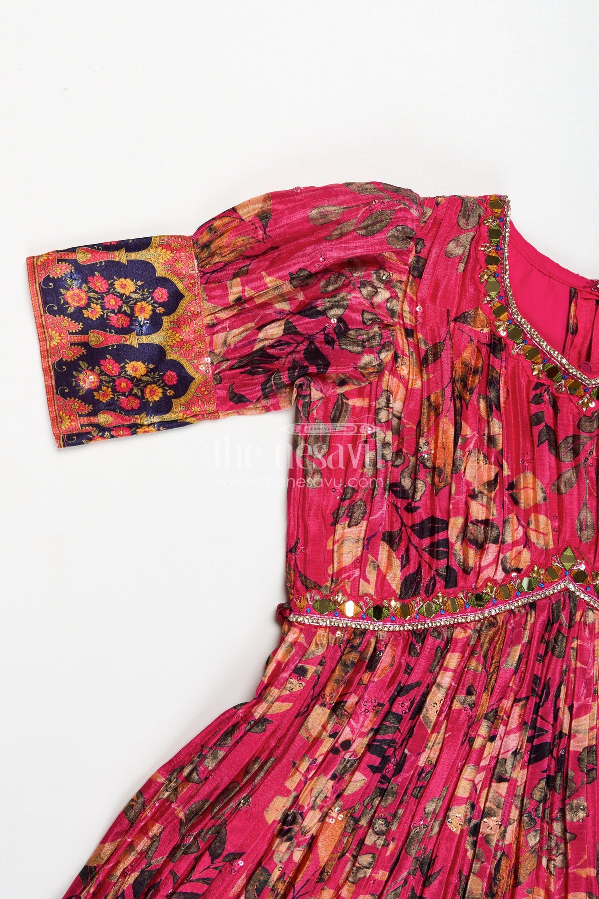 anarkali gown dress gains a vibrant twist with this beautifully printed pink Chinon gown for girls. Designed to make a statement, it features a rich digital print with floral and paisley motifs and a flattering flared silhouette that’s both playful and elegant. The bodice is adorned with mirror work-like embellishments and a shaped yoke, giving it an elevated traditional aesthetic. Puff sleeves with ornate cuff prints add regal flair, making it suitable for festive occasions or family functions. The Chinon fabric is known for its soft drape and gentle feel, ensuring your child stays comfortable while looking effortlessly stylish.