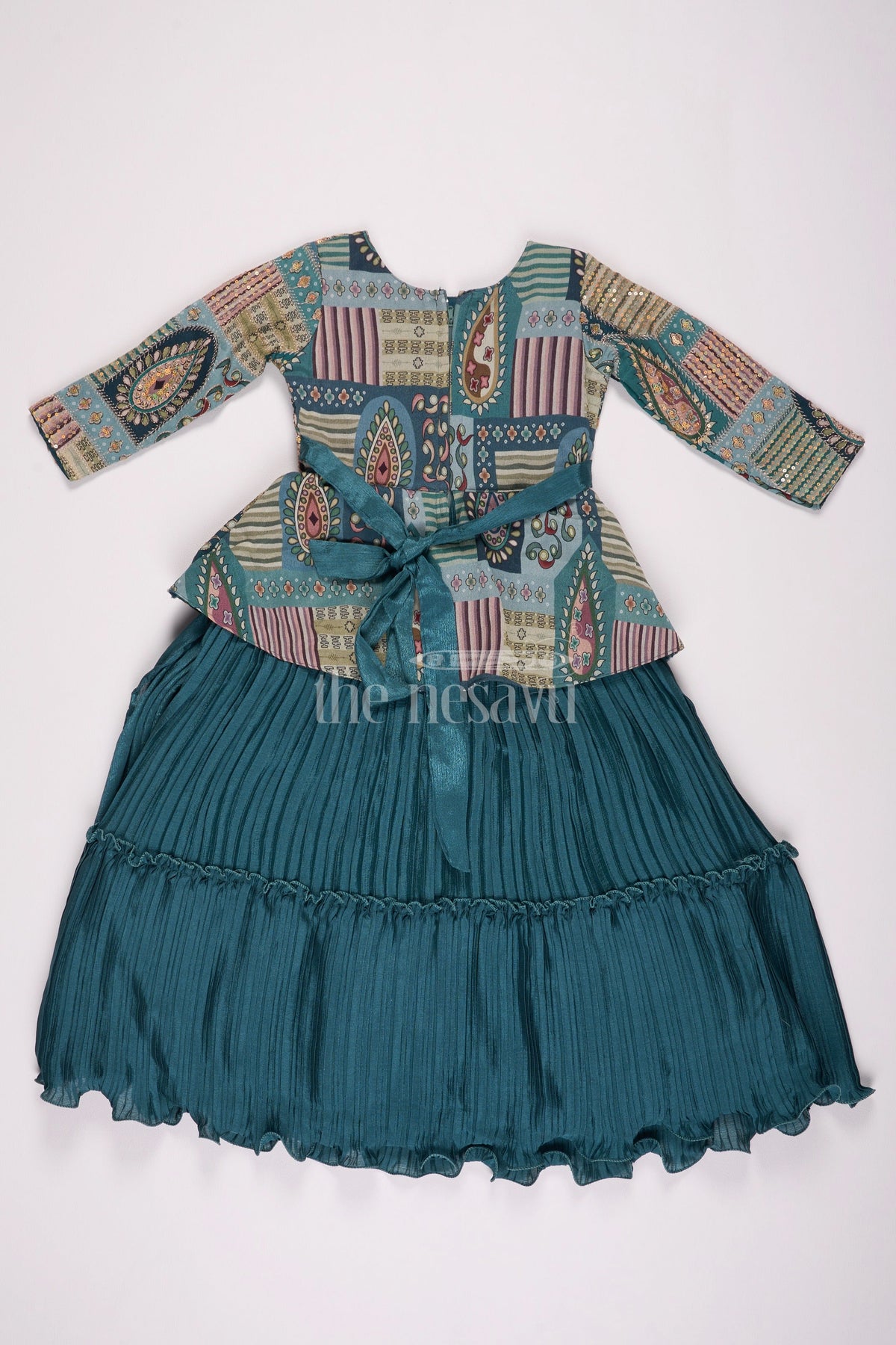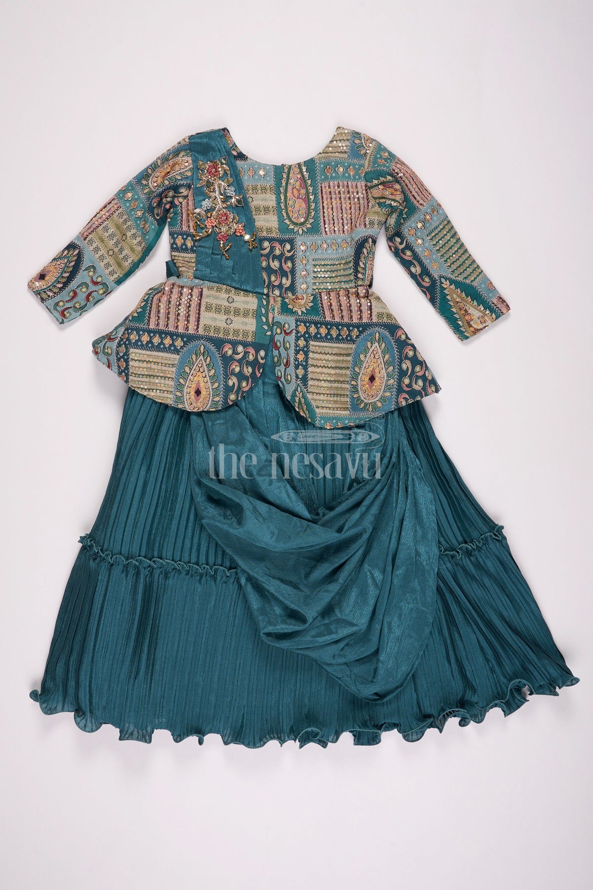 This elegant girls silk gown is crafted from luxurious gold tissue silk that glistens with a soft sheen, creating a captivating look for special occasions. The gown features structured pleats that offer a voluminous silhouette, adding a regal touch to the overall design. Highlighting the waist is an intricately embroidered floral waistband that brings a splash of vibrant color. The puff sleeves provide a nostalgic charm, while the rich red border at the hem contrasts beautifully with the gold fabric, adding a traditional yet striking detail. Perfect for weddings or cultural celebrations, this gown combines timeless design with contemporary flair.