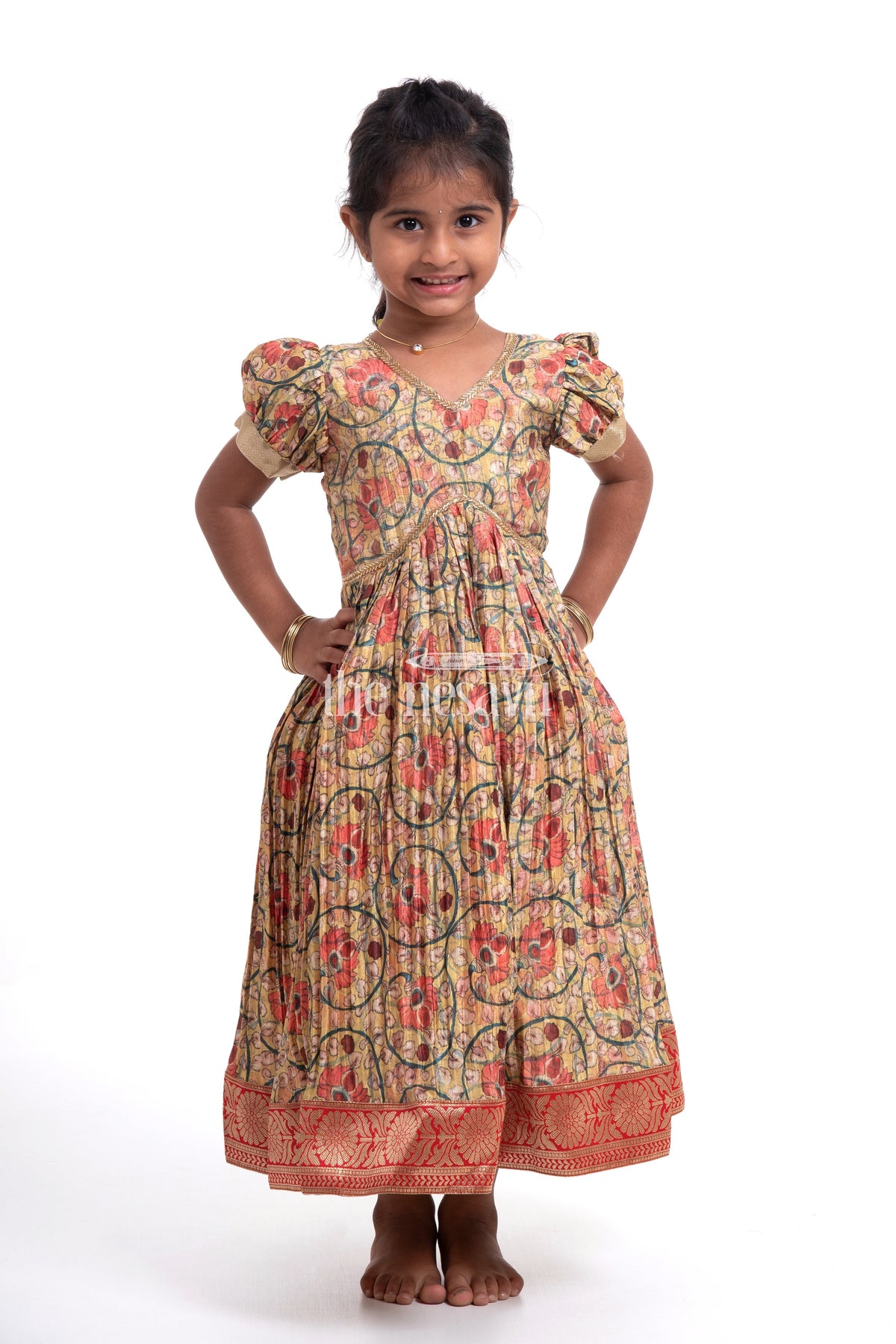 Celebrate special occasions with this Traditional Yellow Kalamkari Chinon Party Gown for Girls. This exquisite gown showcases a vibrant Kalamkari-inspired print on luxurious Chinon fabric, complemented by a brocade attached border and embellished neck and waistline. The Alia cut design offers elegance and comfort for your little one.
