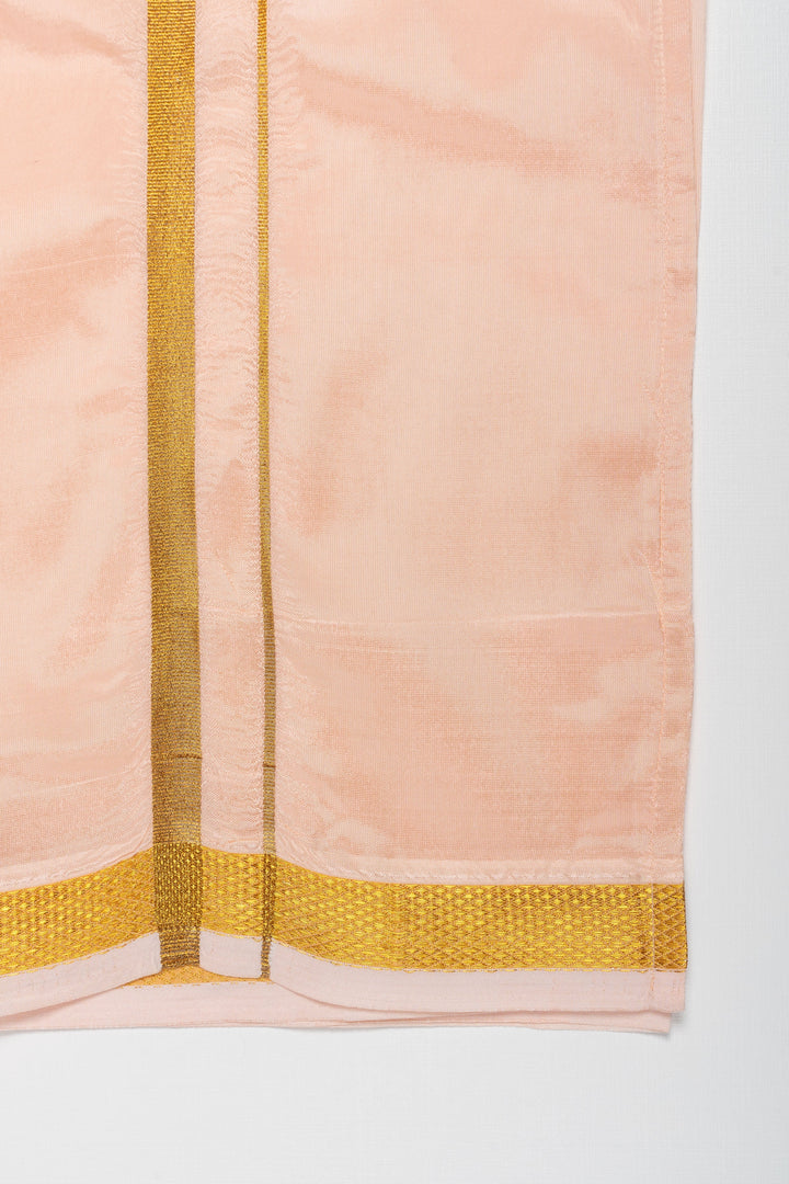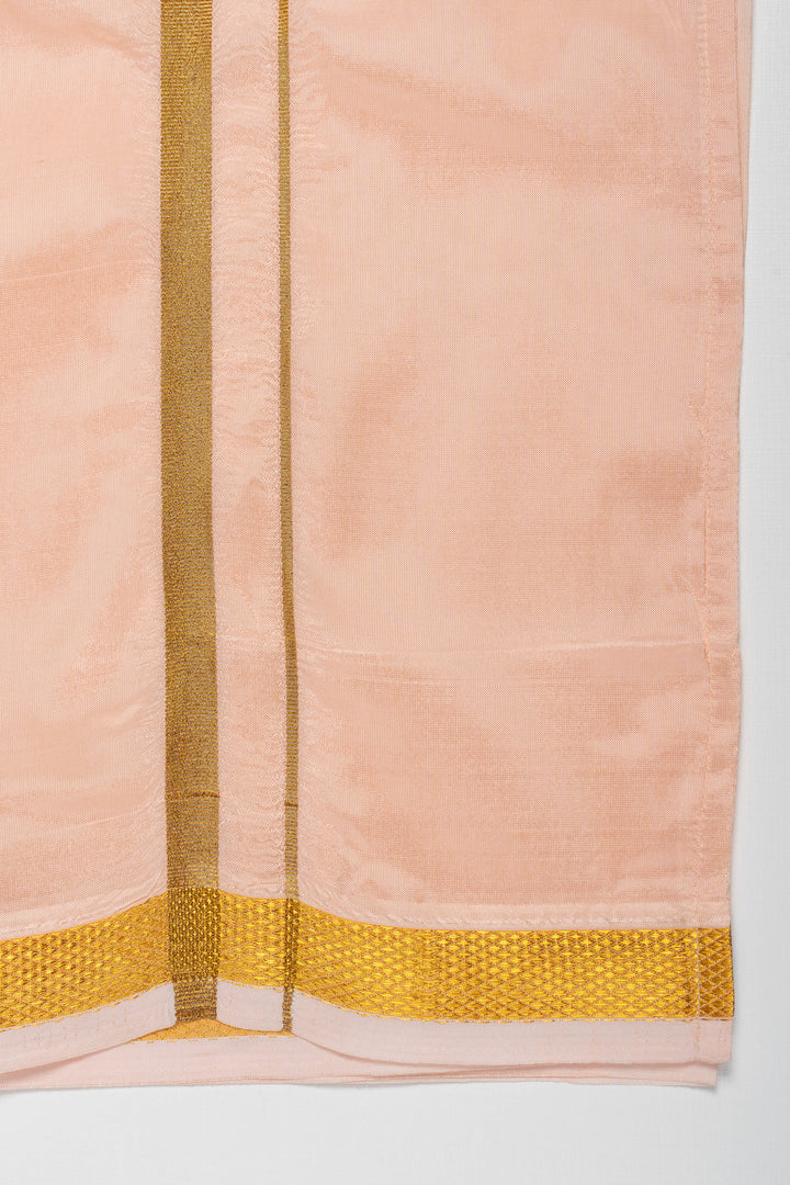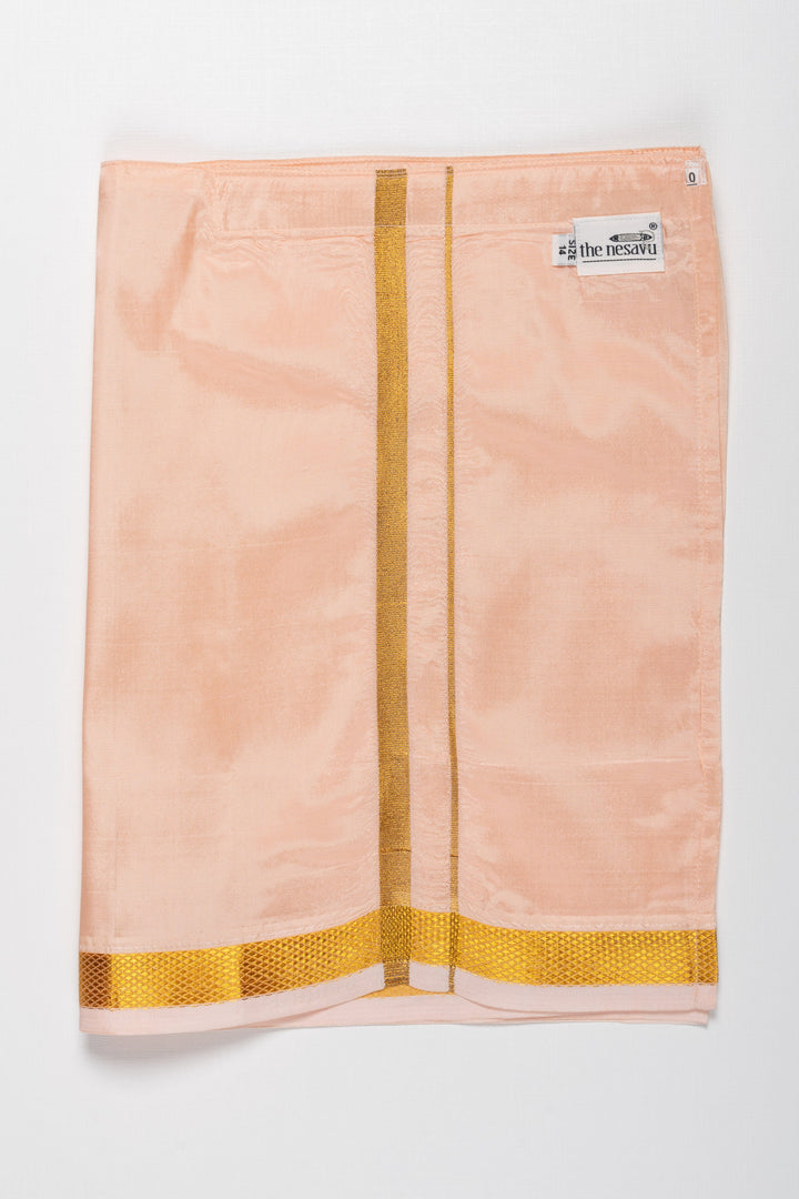 Introducing our Boys' Soft Silk Dhoti in Delicate Pink, perfect for adding a touch of elegance to traditional wear. This exquisite dhoti features a soft pink hue complemented by rich golden vertical stripes and a broad golden border, making it a standout piece for any festive or cultural event. Tailored from high-quality silk, it offers both luxury and comfort, ensuring your young one feels great while looking dapper. Ideal for weddings, religious ceremonies, or family gatherings, this dhoti pairs beautifully with traditional kurtas and ethnic wear, creating a look of understated elegance.