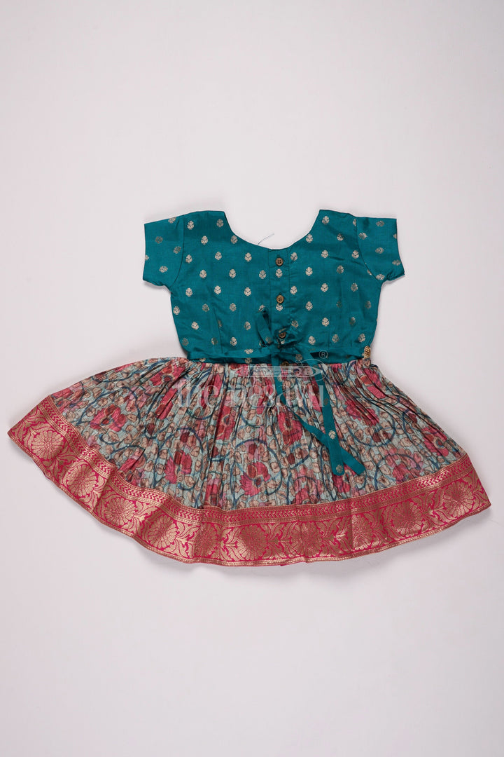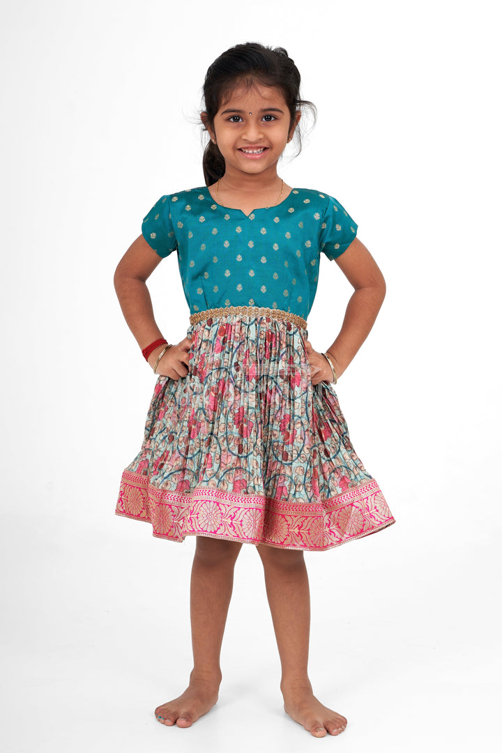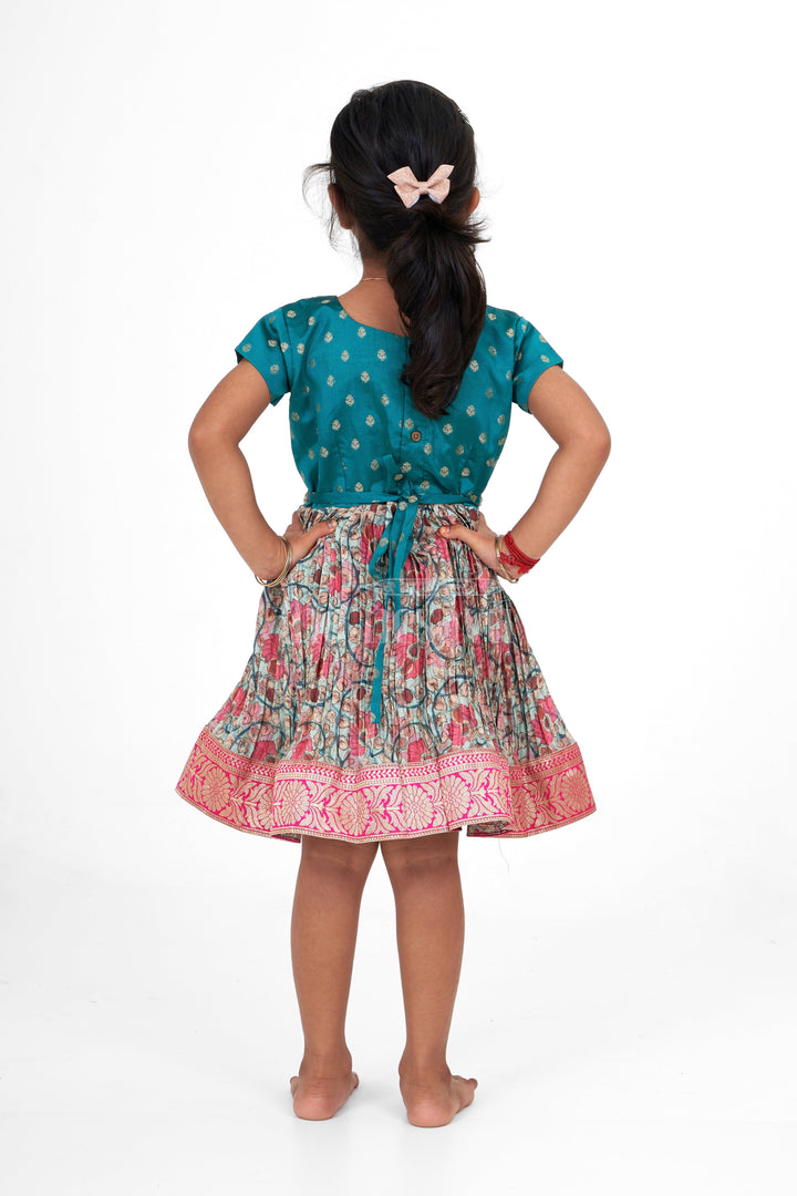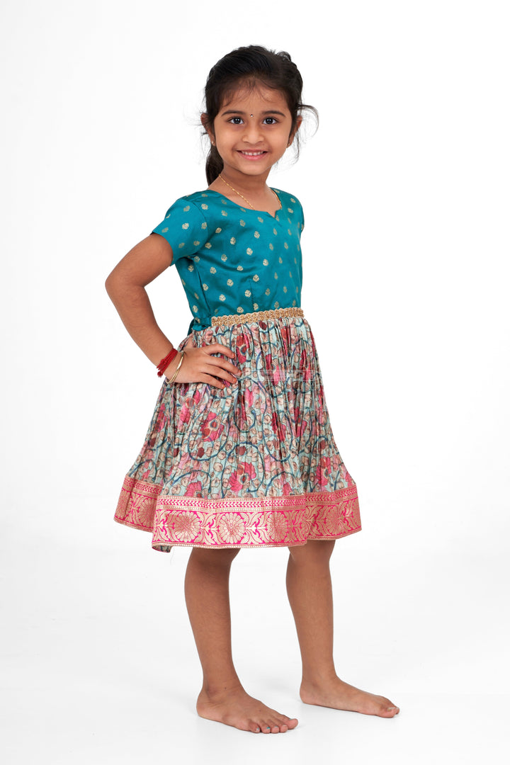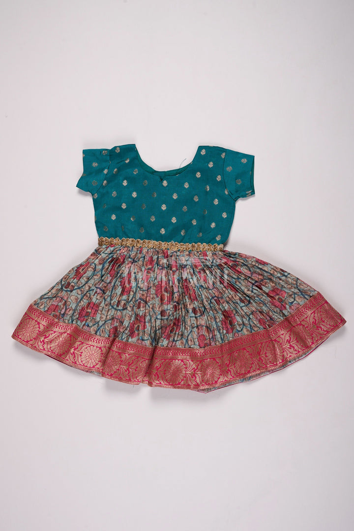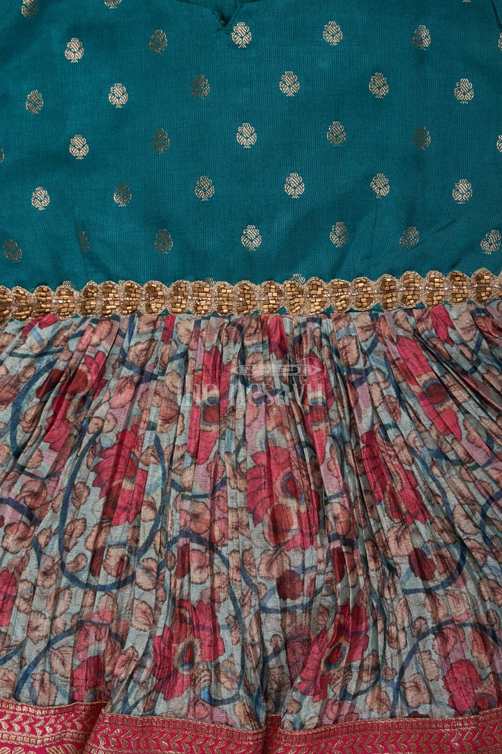 Designed for celebrations, this Christmas party dress is crafted from premium pleated silk to exude festive charm. The teal bodice is accented with shimmering golden dots, while the pleated floral skirt in shades of pink and blue adds a pop of color. A zari border at the hem completes the look, making it perfect for Christmas celebrations or a joyful family party. Lightweight and breathable, this dress keeps your child stylish and comfortable all day long.