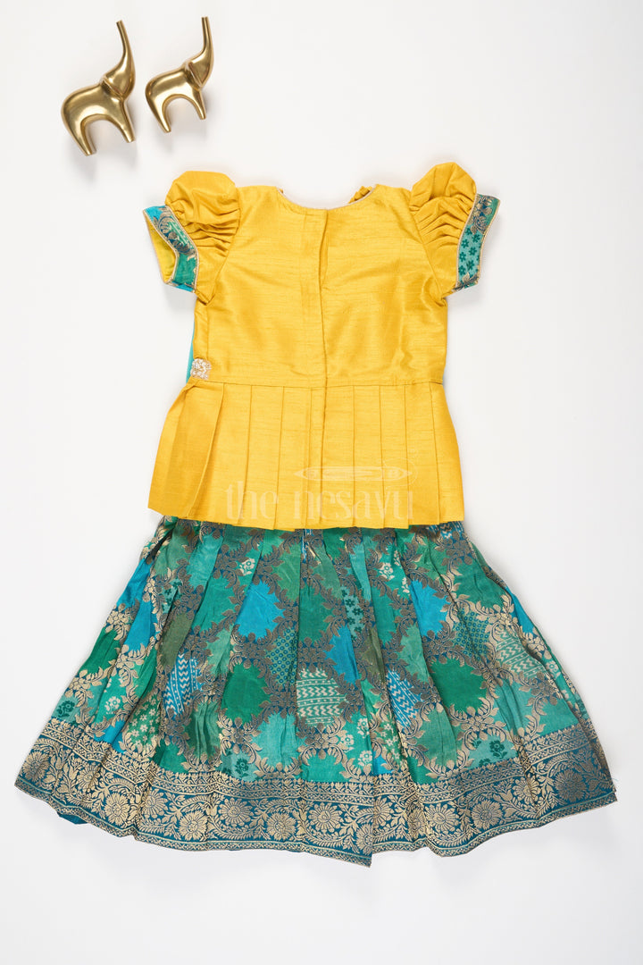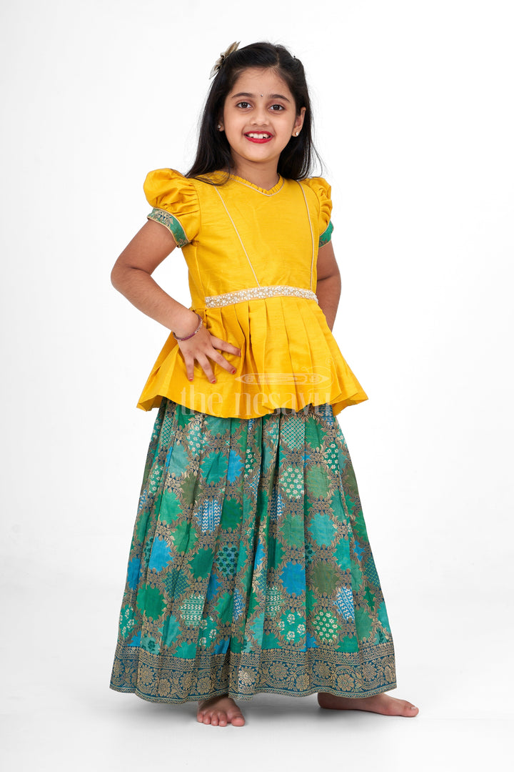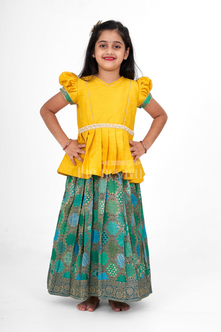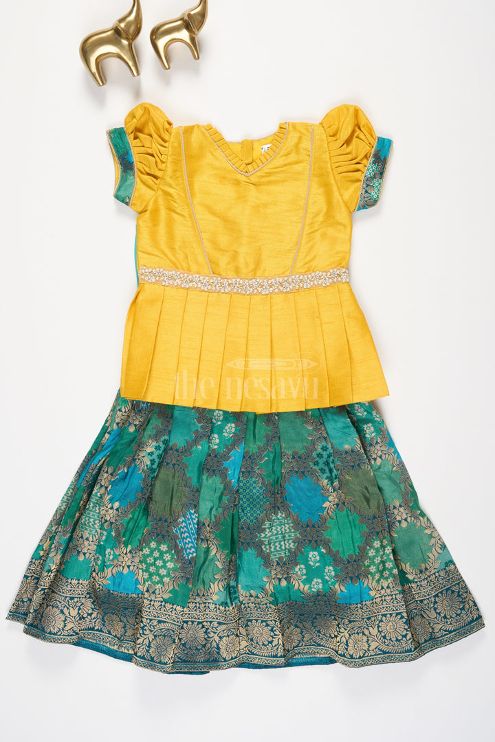 This vibrant pattu pavadai set features a bright yellow blouse with pleated detailing at the waist and puff sleeves for a traditional touch. The blouse is accented with a beaded waistline embellishment, adding a festive sparkle to the design. The green skirt, crafted from rich brocade fabric, showcases intricate floral and geometric patterns in gold, creating a stunning contrast with the blouse. This ensemble perfectly blends traditional Indian design with a playful and modern color palette, making it an ideal choice for festive occasions such as weddings and family gatherings.