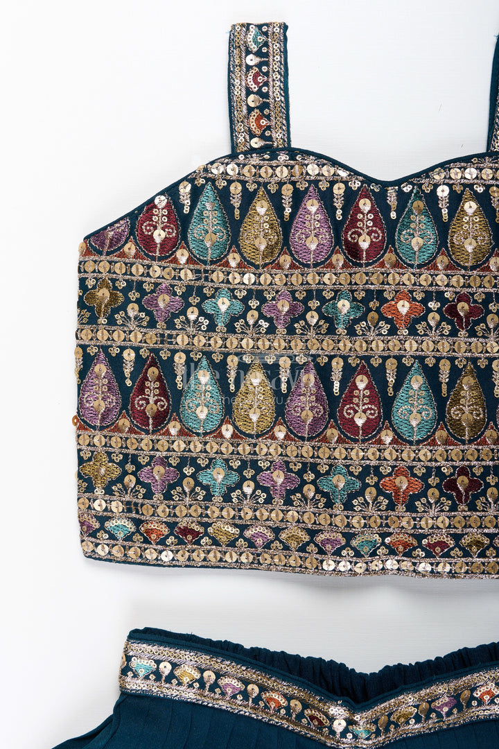 • Rich mirror and thread embroidery in ethnic patterns throughout the top