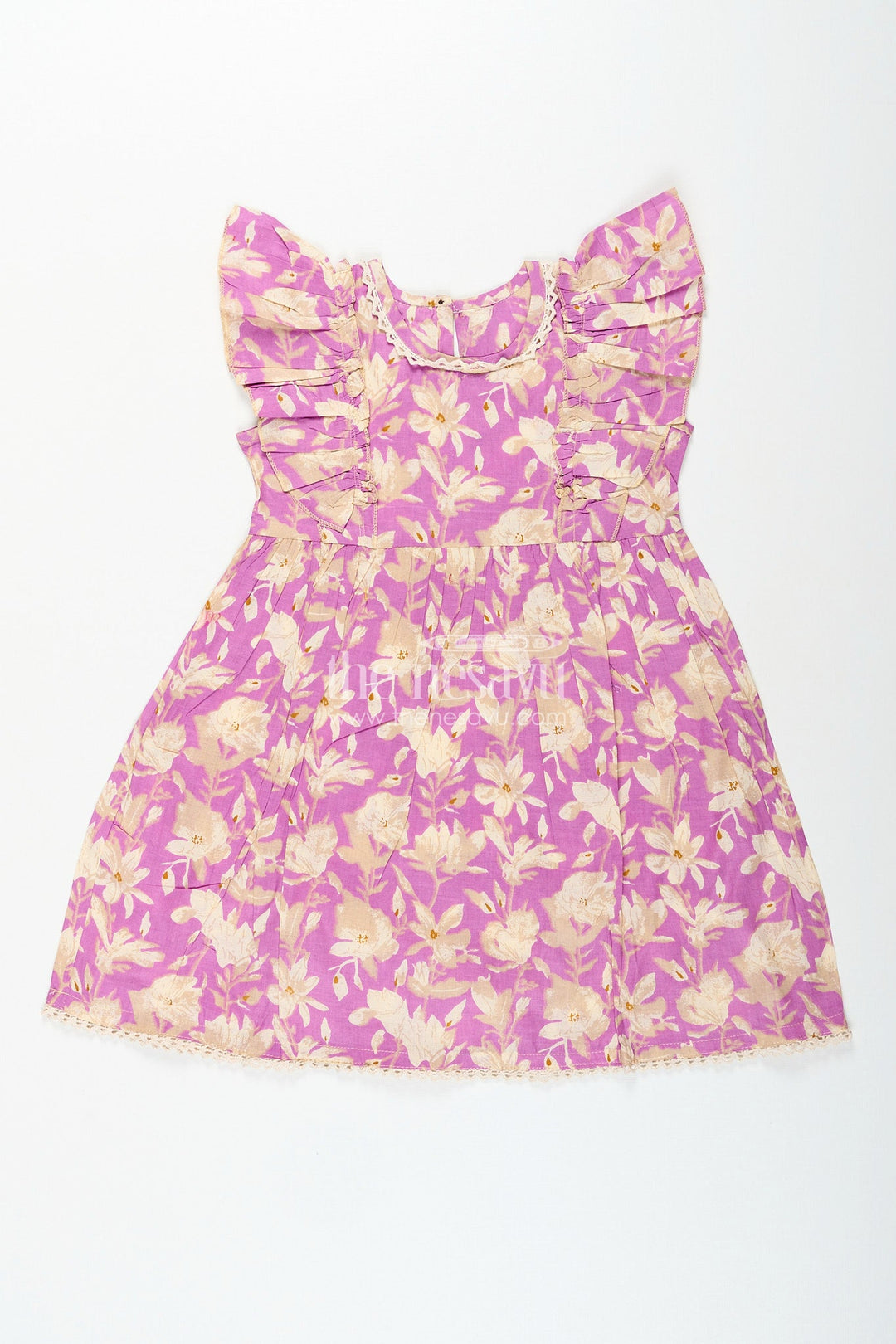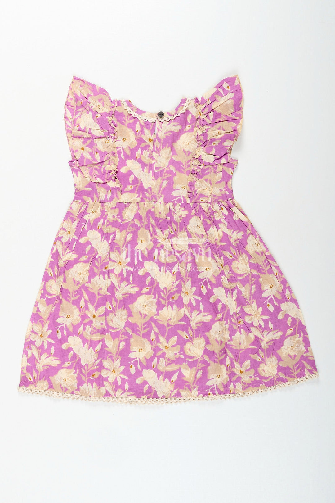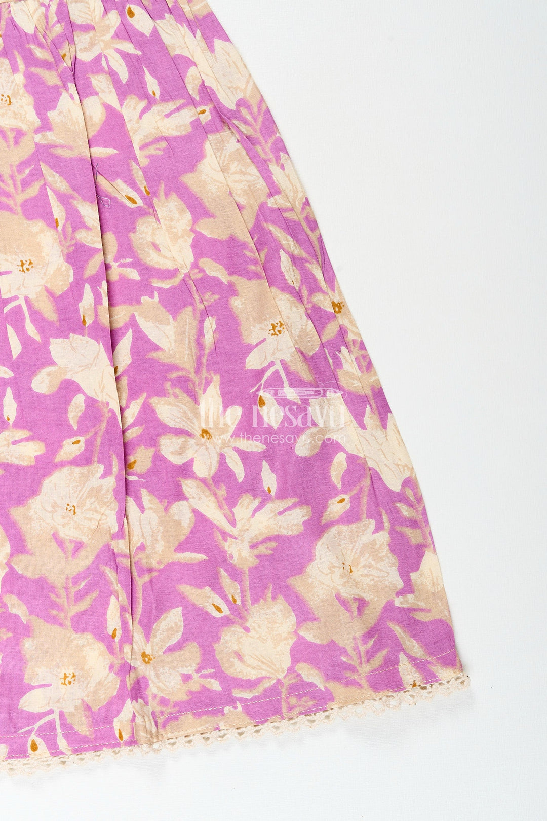 - Design: Floral digital print, lace trim at neck and hem