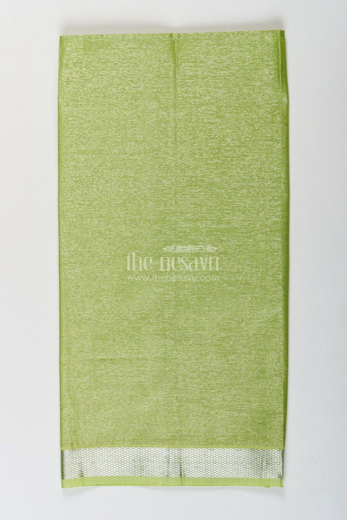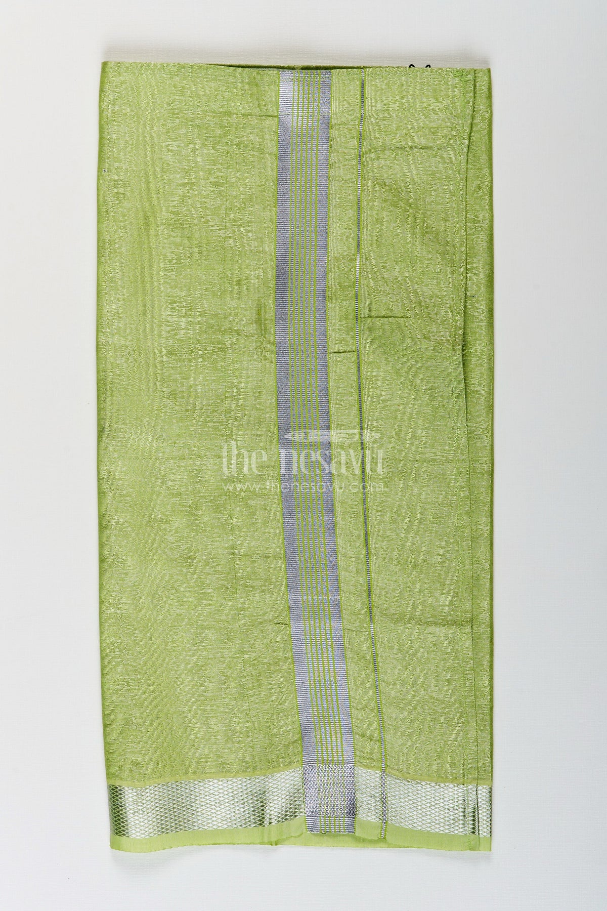 The Nesavu Boys Vesti Boys Tissue Dhoti in Light Green with Silver Zari for Vibrant Traditional Style in Latest Dhoti Look Nesavu Boys Latest Dhoti Light Green Tissue Silver Zari Border Stylish Ethnic Wear | The Nesavu