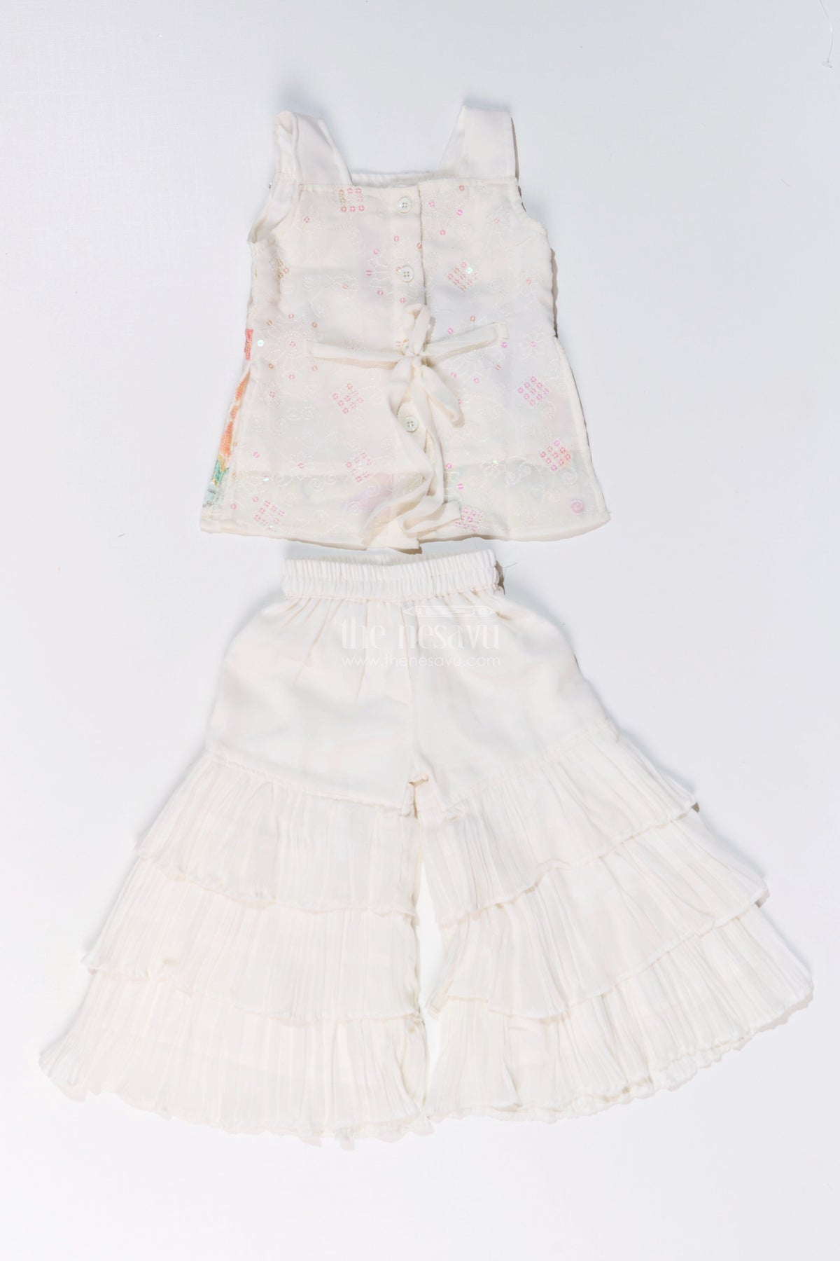 The Nesavu Girls Sharara / Plazo Set Girls Off White Sharara with Floral Embroidered Top and Layered Ruffle Pants Nesavu 16 (1Y) / Cream GPS548A-16 Nesavu Girls Off White Sharara Floral Embroidered Top Layered Ruffle Pants