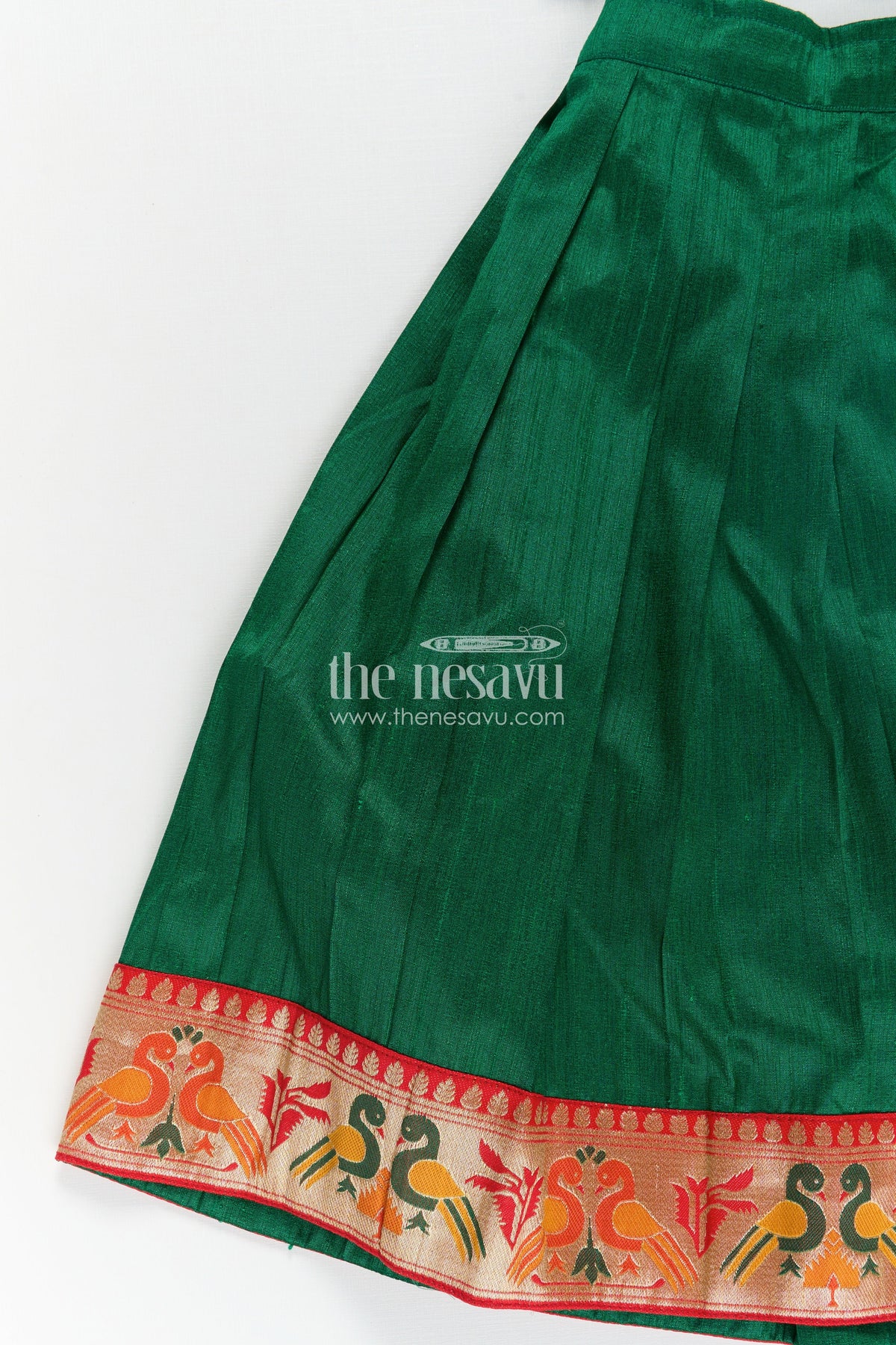 Lehengha pattu brings rich tradition to life in this stunning green pattu pavadai set for girls. Crafted from raw silk, the lehenga features vibrant pleats and a classic paithani border adorned with peacock and floral motifs. The sleeveless blouse is highlighted by a golden yoke embellished with fine embroidery and pleated detailing at the waistline for added flair. Ideal for weddings, cultural functions, or festive celebrations, this set offers regal charm with child-friendly comfort. Its lightweight texture and vivid color make it a standout addition to every young girl’s ethnic wardrobe.