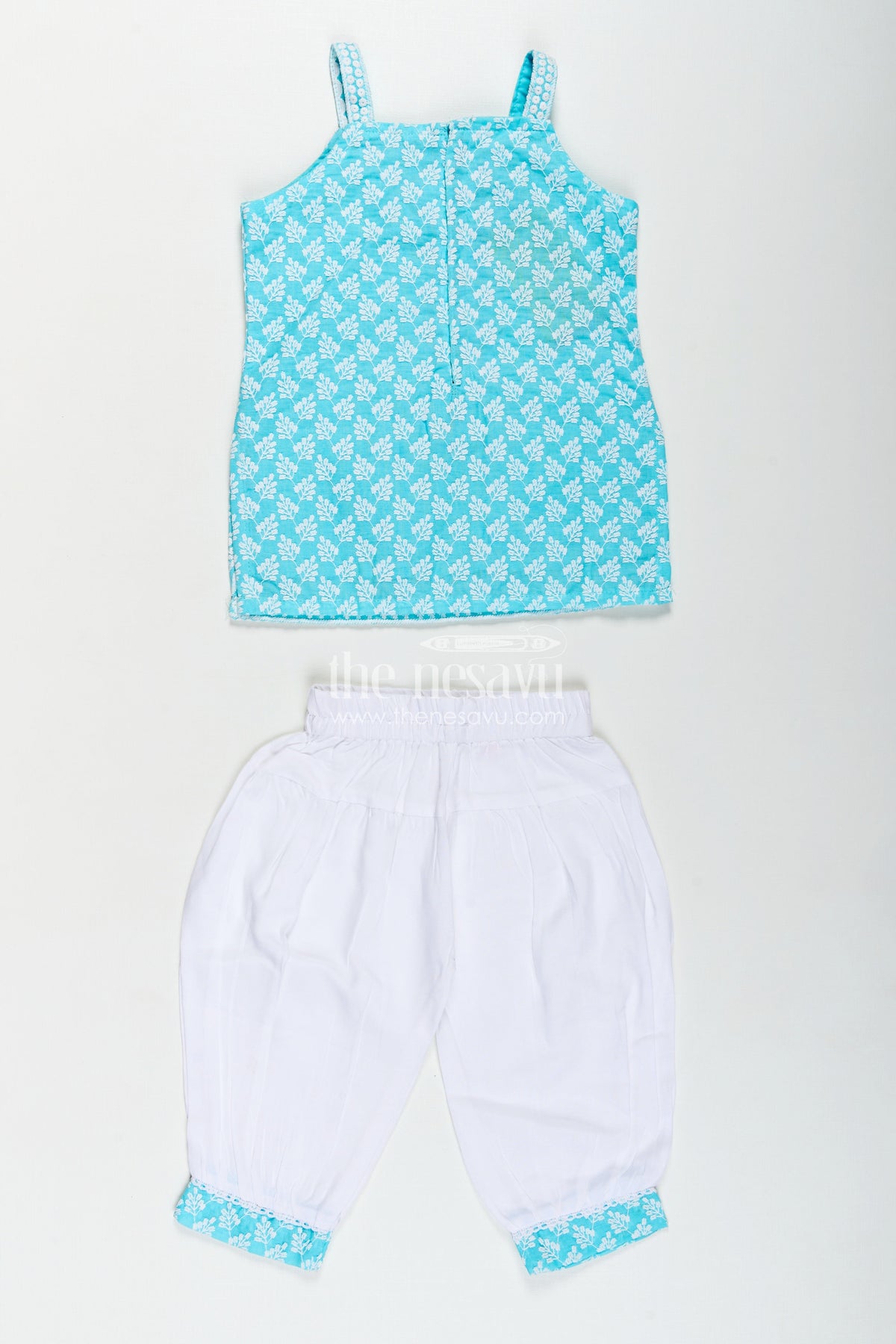 This new chudi set brings freshness to traditional wear with its beautifully embroidered blue cotton top and comfortable white dhoti-style pants. The sleeveless kurti features an intricate white thread embroidery yoke, complemented by a delicate lace neckline and digitally printed border. The dhoti pants, designed for ease and movement, are enhanced with matching blue embroidery at the cuffs. A soft white dupatta with tassel accents completes this charming ethnic look. Crafted from breathable cotton, this outfit ensures style and comfort for little girls during festive gatherings and cultural functions.