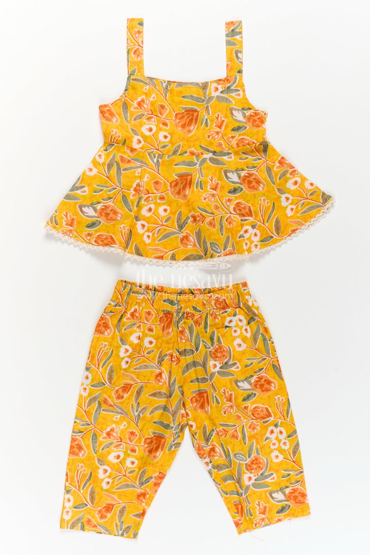 Sleeveless dresses get a lively twist with this mustard-colored girls set, featuring a flowy top and elastic waist pants in a coordinated floral digital print. Adorned with delicate orange blossoms and green foliage, the sleeveless top offers a summery feel with its flared silhouette and subtle lace trim. Paired with matching pants for a complete look, the set is made from lightweight cotton that keeps your child cool and carefree throughout the day. Designed for easy dressing and maximum comfort, this set is an excellent pick for casual outings, playtime, or even low-key festive events. Bright, stylish, and full of youthful energy just like your little one.