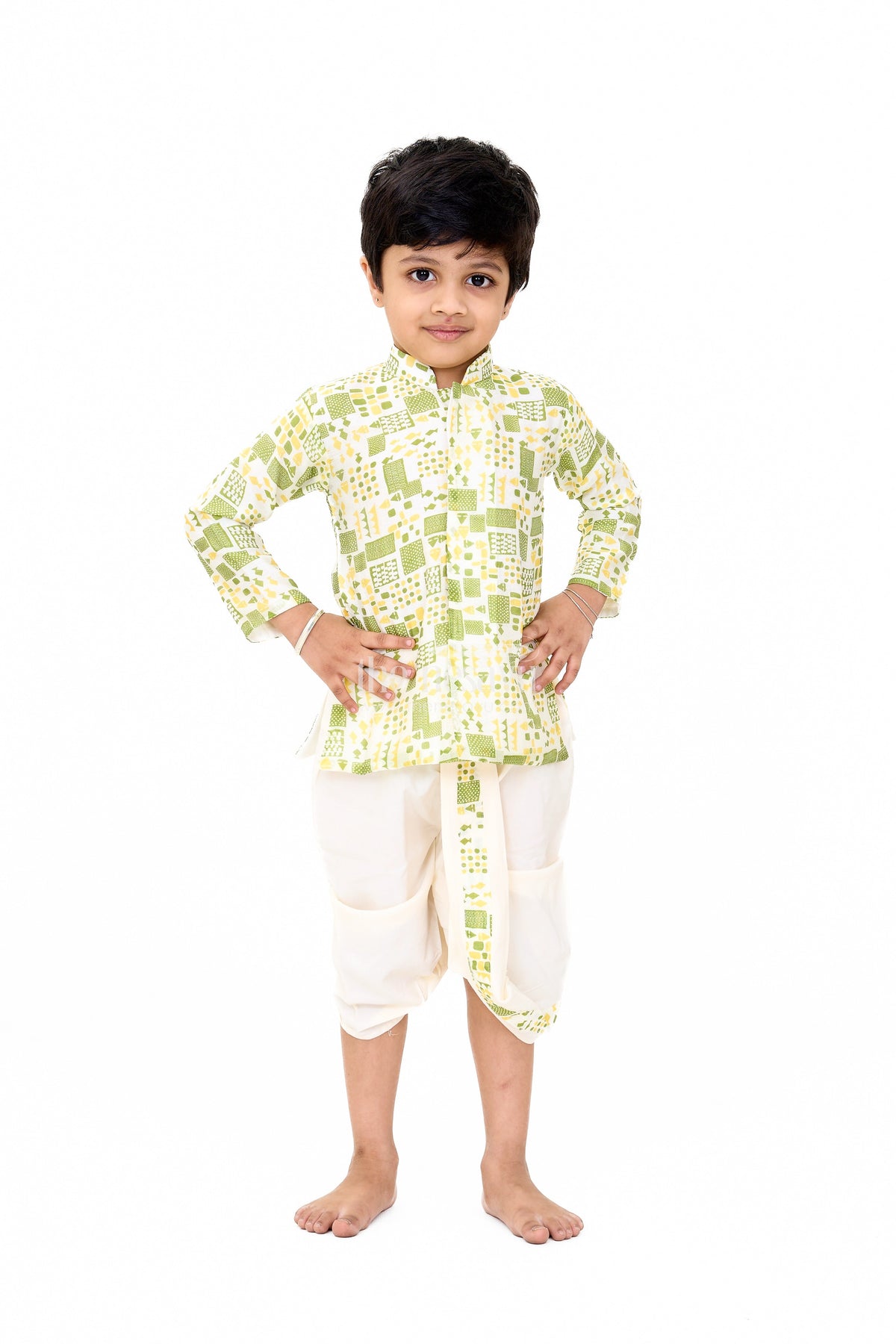 This charming boys dhoti and shirt set is a stylish choice for traditional gatherings and cultural festivities. The green printed shirt features an artistic geometric pattern, making it both unique and eye-catching. Designed with a mandarin collar and full sleeves, this set combines a modern aesthetic with classic tradition. The cream-colored dhoti complements the shirt perfectly, featuring a matching printed border for a coordinated look. Crafted from a breathable cotton blend fabric, this outfit ensures comfort throughout the day, making it an ideal choice for weddings, family functions, and festivals.