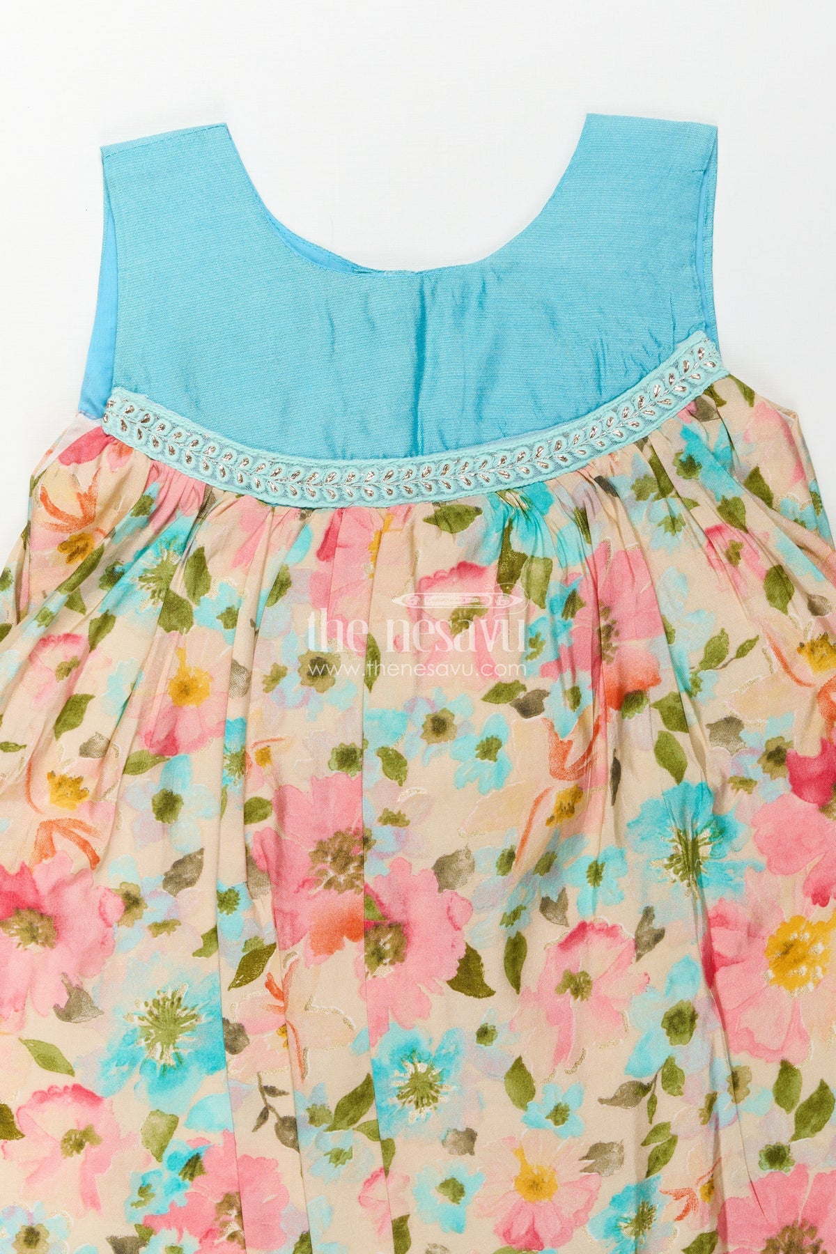 The Nesavu Girls Chanderi Frock Girls Printed Viscose Frock with Bright Floral Motifs and Blue Yoke in Long Frock for Party Wear Style Nesavu Girls Long Frock Party Wear Floral Printed Viscose Blue Embroidered Yoke Flowy Fit | The Nesavu