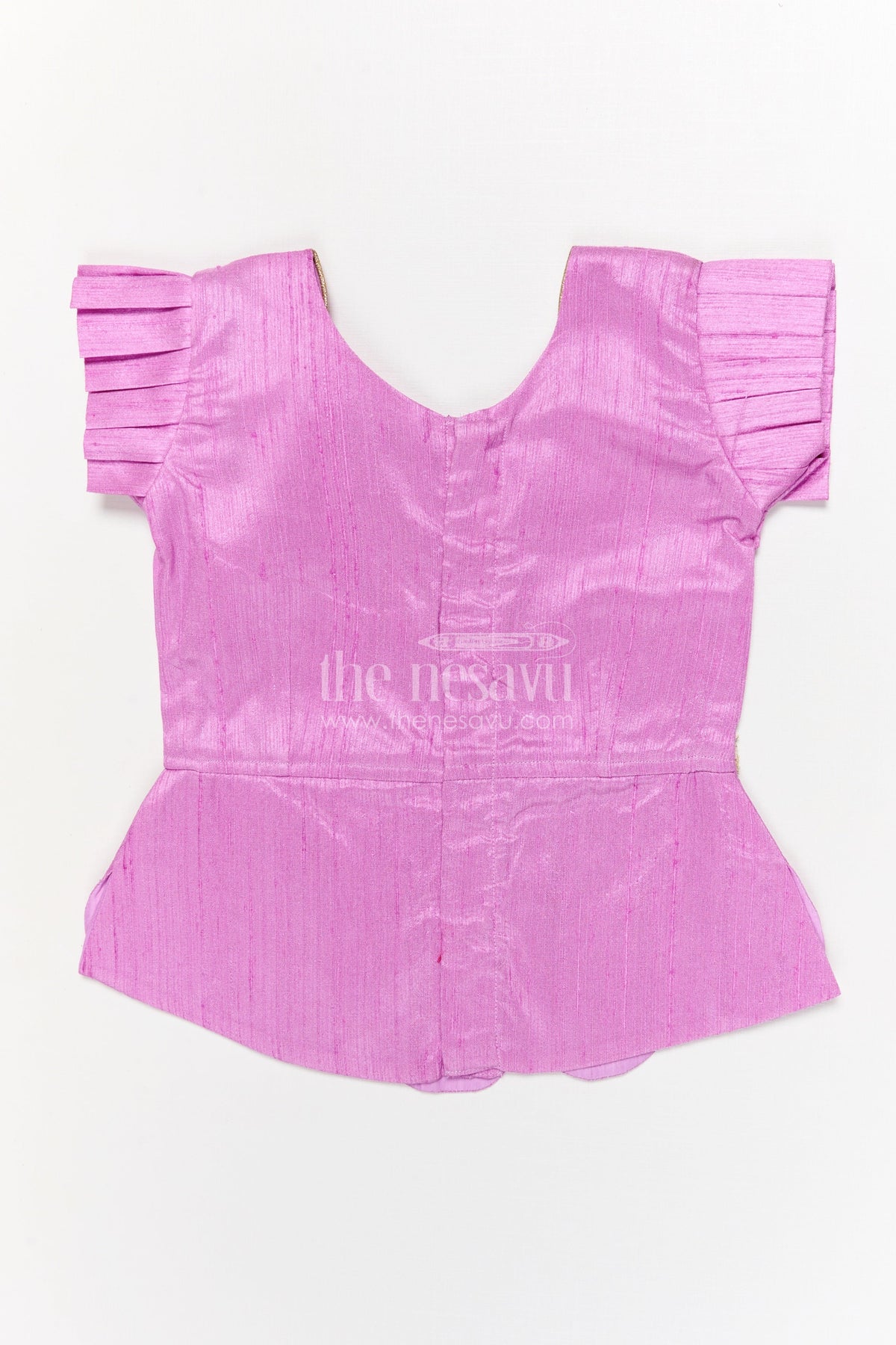 Features a scallop-hem raw silk blouse with layered pleated sleeves for an elegant ethnic vibe