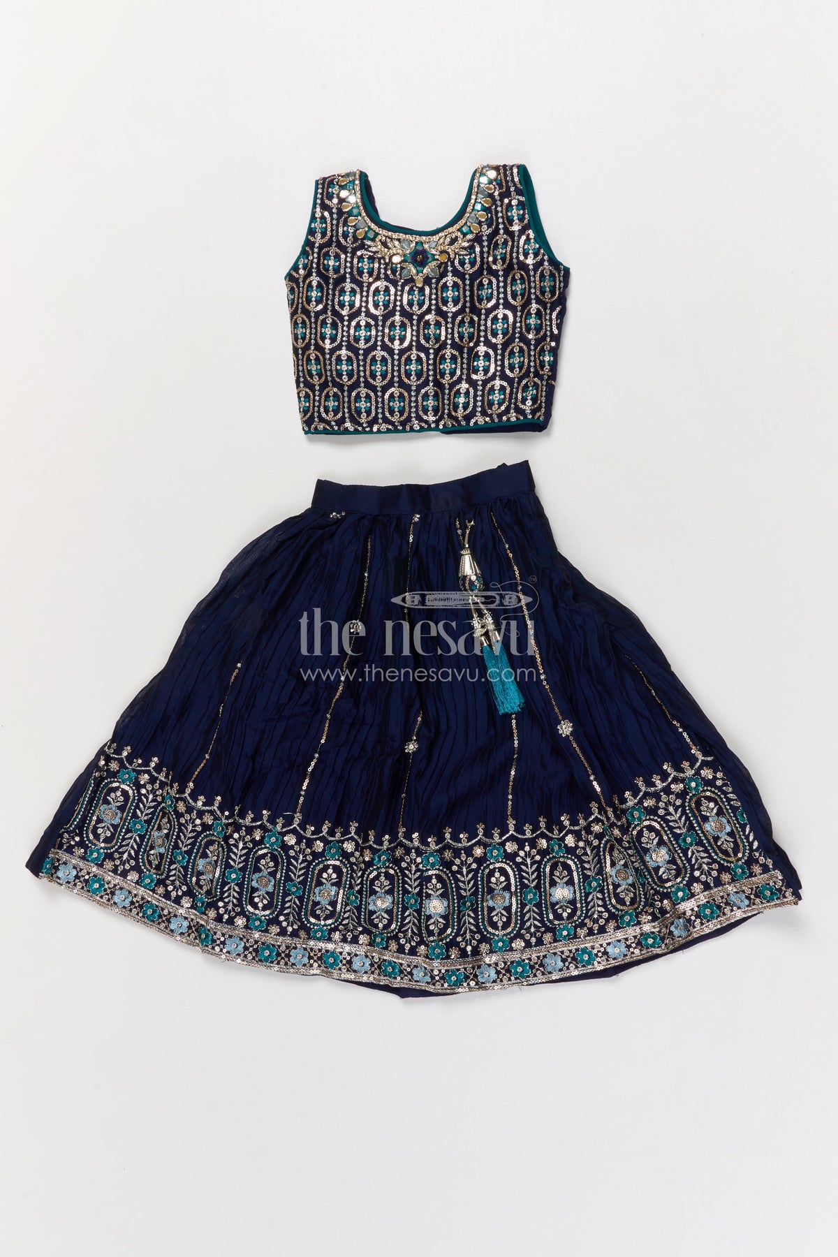 The pleated skirt features intricate embroidery with sequins and threadwork